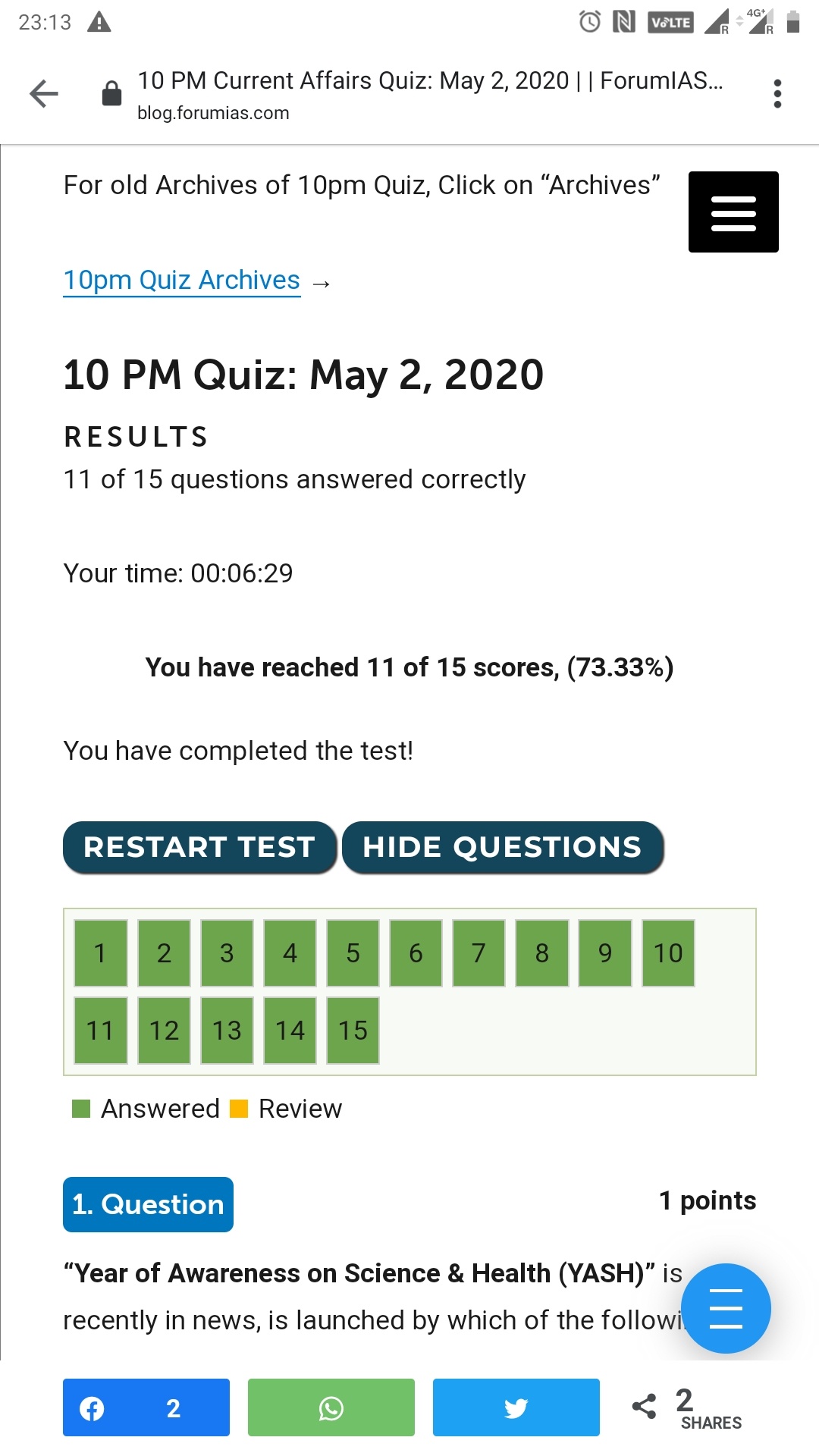 About 10pm Quiz- In this initiative, we post 15 MCQs daily. Questions are based on Current affairs. We at ForumIAS believe that practicing quality questions on a daily basis can boost students’ prelims preparation.