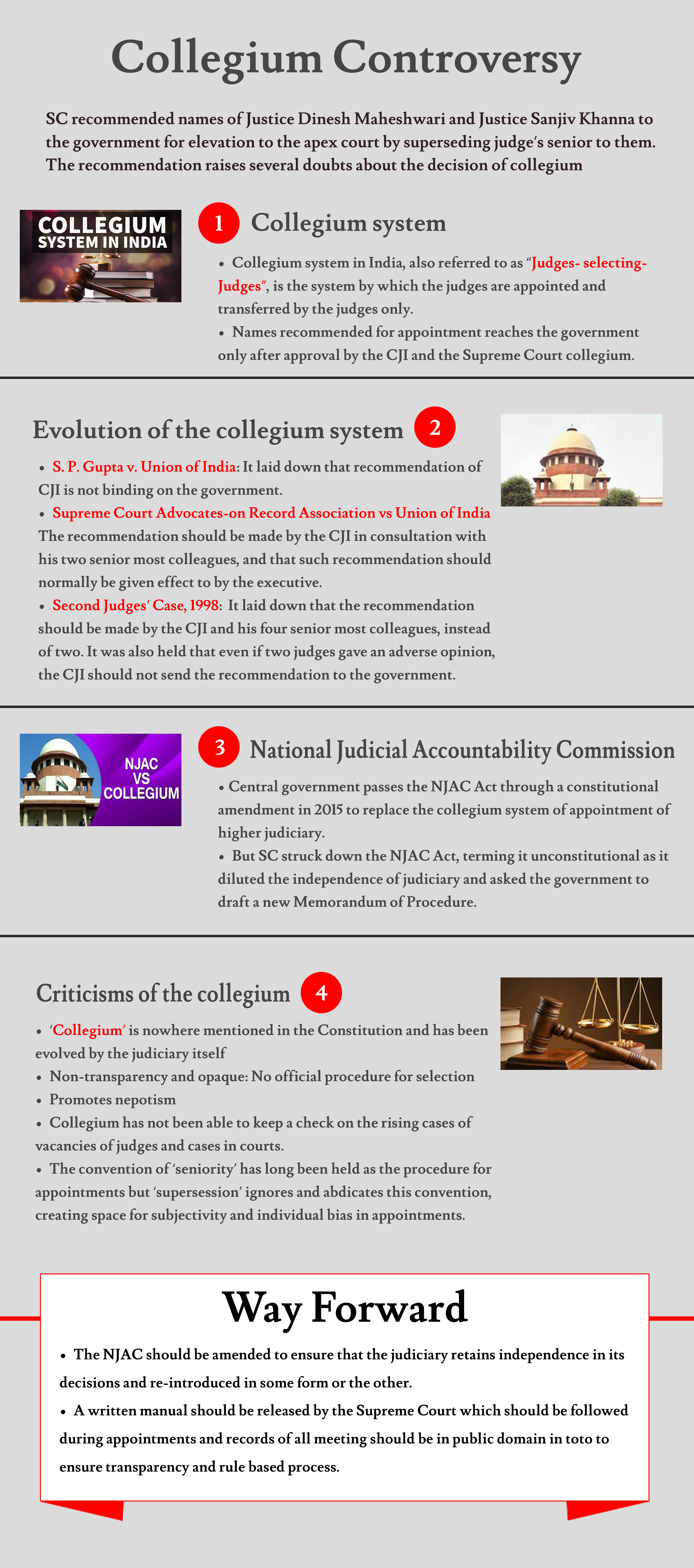 - Central government passes the NJAC Act through a constitutional amendment in 2015 to replace the collegium system of appointment of higher judiciary.