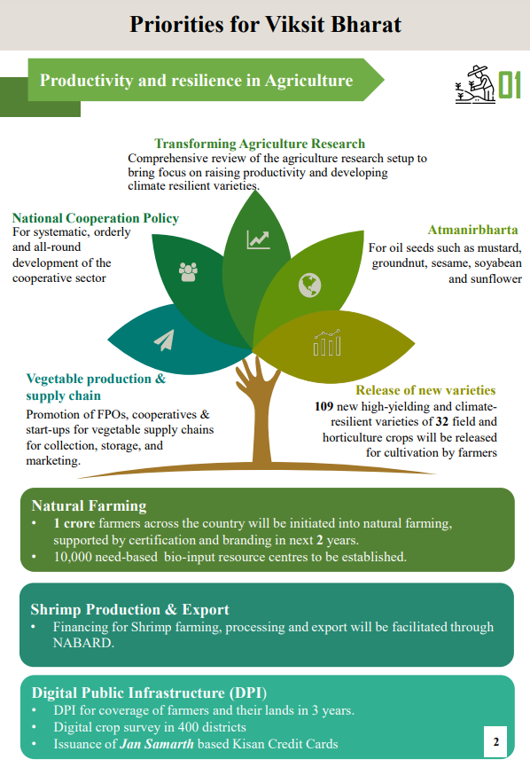 Digital Public Infrastructure for Agriculture- The Use of DPI in agriculture will facilitate the implementation of the Digital Public Infrastructure (DPI) in agriculture for coverage of farmers and their lands in 3 years. During this year, digital crop survey for Kharif using the DPI will be taken up in 400 districts. The details of 6 crore farmers and their lands will be brought into the farmer and land registries. Further, the issuance of Jan Samarth based Kisan Credit Cards will be enabled in 5 states.
