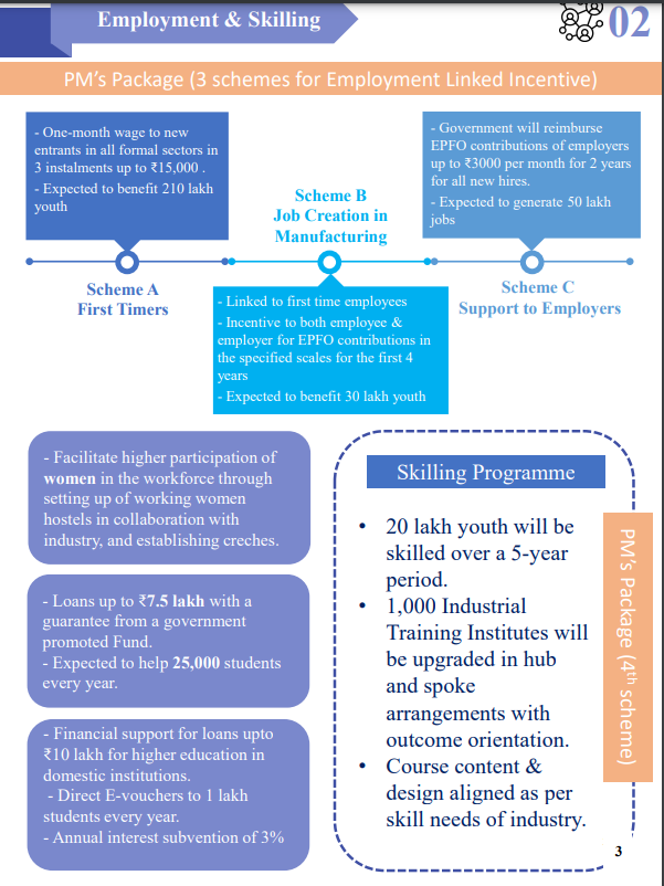 Employment Linked Incentive- 3 schemes for ‘Employment Linked Incentive’, as part of the Prime Minister’s package. These will be based on enrolment in the EPFO, and focus on recognition of first-time employees, and support to employees and employers.
