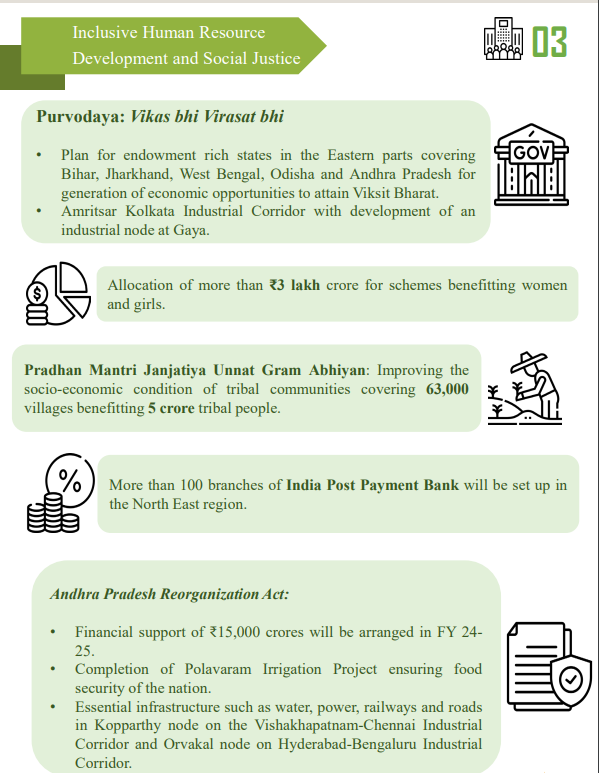 Purvodaya- A plan, Purvodaya, for the all-round development of the eastern region of the country covering Bihar, Jharkhand, West Bengal, Odisha and Andhra Pradesh. This will cover human resource development, infrastructure, and generation of economic opportunities to make the region an engine to attain Viksit Bharat.