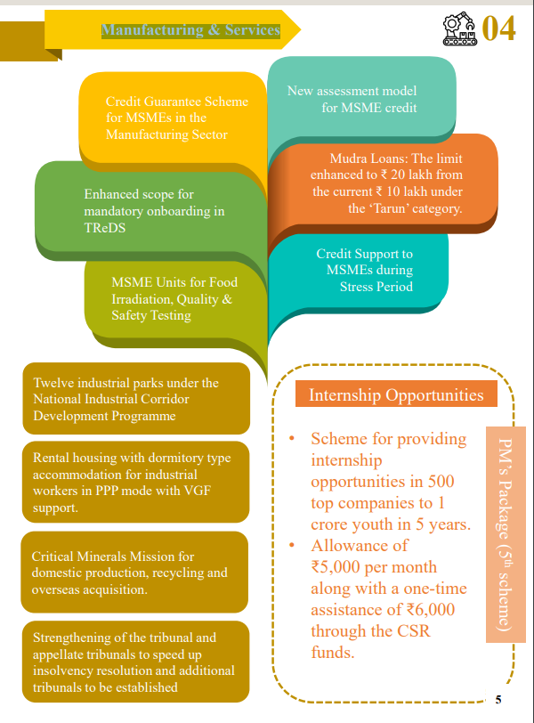 Industrial Parks- Development of investment-ready “plug and play” industrial parks with complete infrastructure in or near 100 cities. Twelve industrial parks under the National Industrial Corridor Development Programme also will be sanctioned.