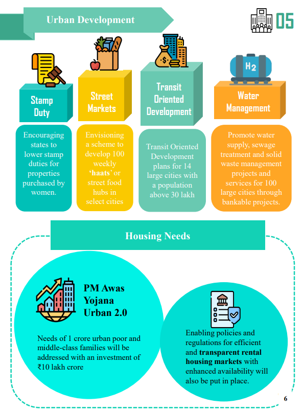 Urban Housing- Under the PM Awas Yojana Urban 2.0, housing needs of 1 crore urban poor and middle-class families will be addressed with an investment of ₹ 10 lakh crore. This will include the central assistance of ₹ 2.2 lakh crore in the next 5 years.