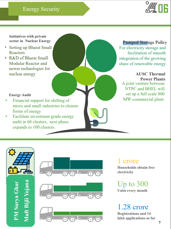 Pumped Storage Policy- A policy for promoting pumped storage projects will be brought out for electricity storage and facilitating smooth integration of the growing share of renewable energy with its variable & intermittent nature in the overall energy mix.