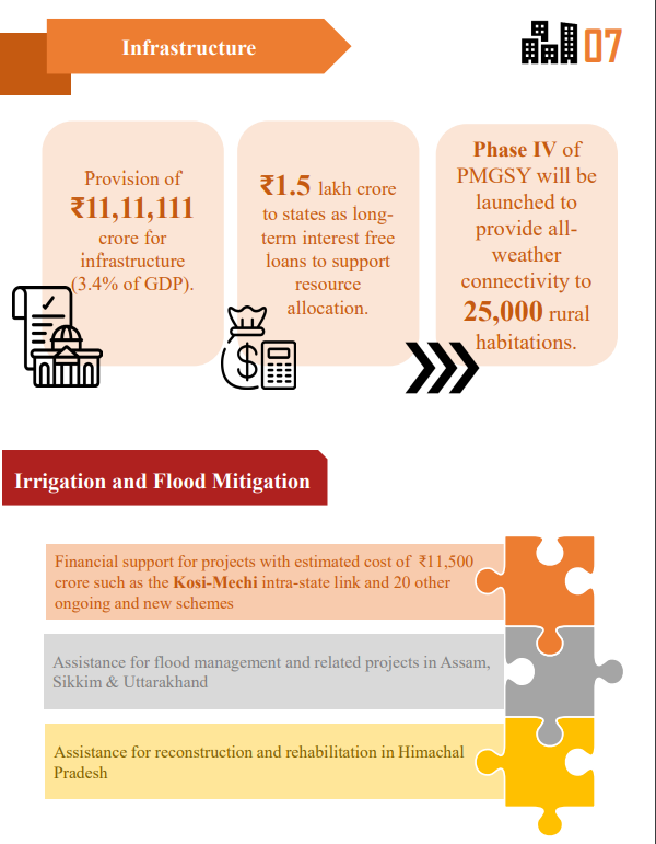 Infrastructure provisions- Provision of ₹11,11,111 crore for infrastructure (3.4% of GDP) has been made for capital expenditure. Provision of ₹1.5 lakh crore to states as long term interest free loans to support resource allocation.