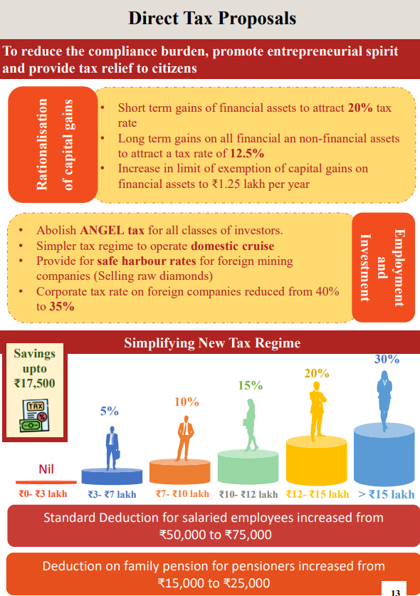 Simplifying Personal Tax Regime- Standard Deduction for salaried employees increased from ₹50,000 to ₹75,000. Deduction on family pension for pensioners increased from ₹15,000 to ₹25,000.