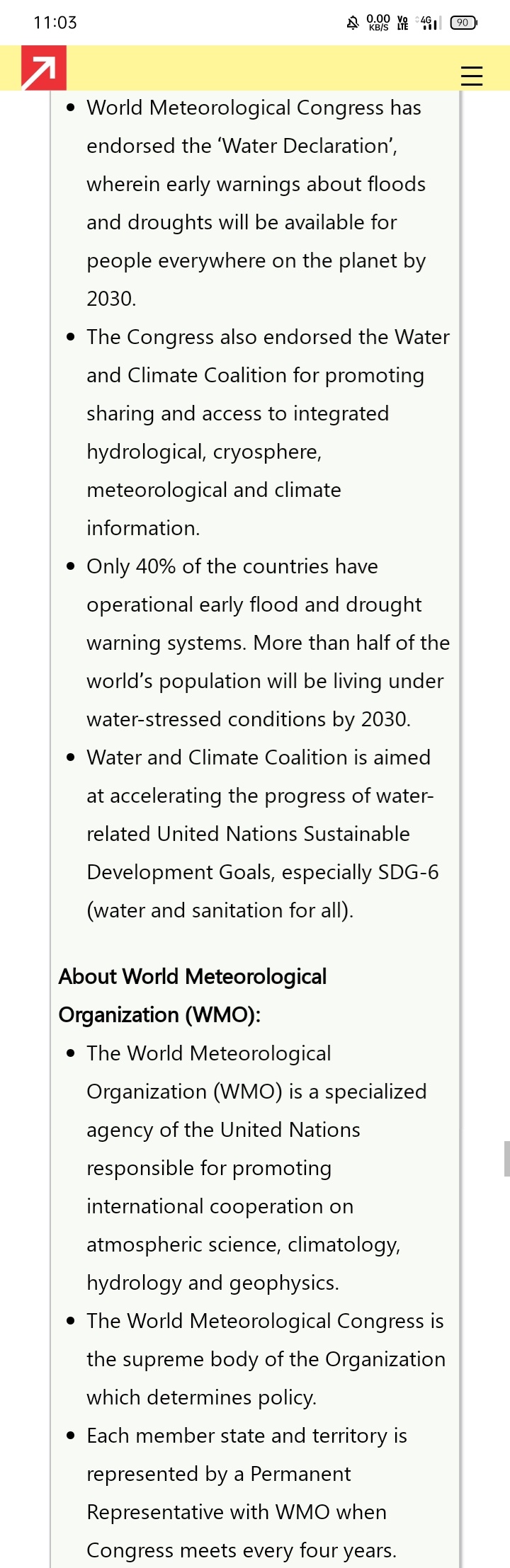* World Meteorological Congress (supreme body of WMO) has endorsed the ‘Water Declaration’, wherein early warnings about floods and droughts will be available for people everywhere on the planet by 2030.