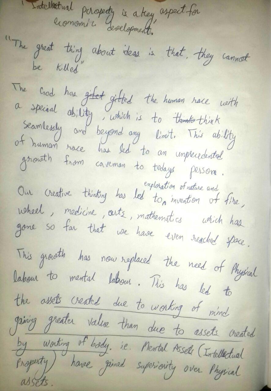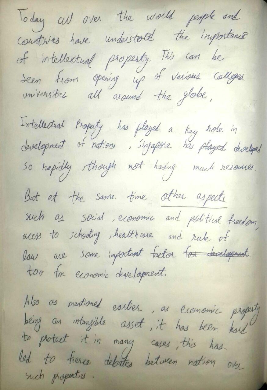 2. focus on topic.. understand its demand.. You have majorly focussed on explaining what is IP, types of it.. good for an assignment but not for this topic.. here, the topic’s keyword was “KEY” which means IP is necessity for economic development.. so keep relating to topic in every other para.. it gives the examiner feel ohh he has not diverted