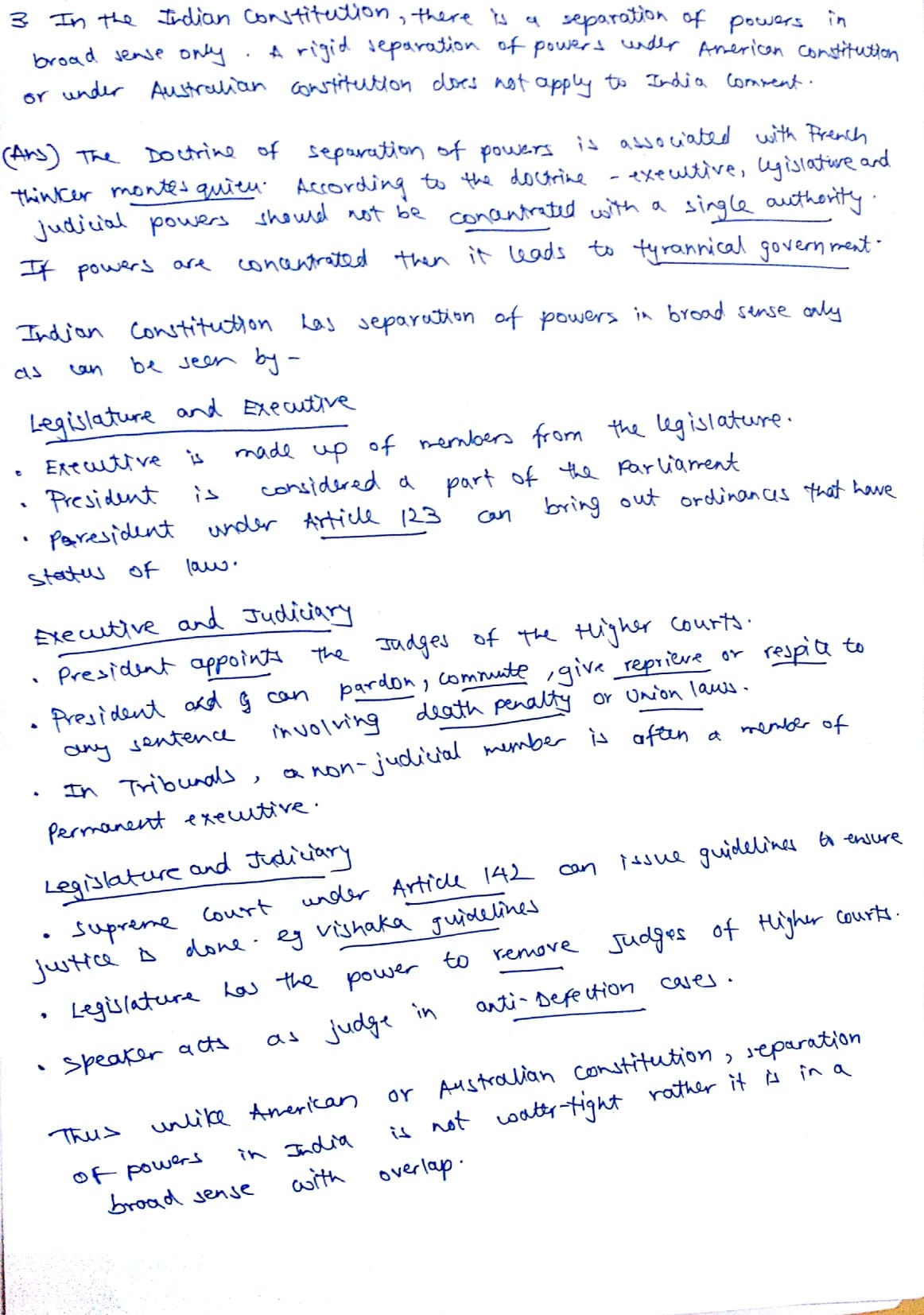 Q3- In the Indian Constitution, there is separation of powers in a broad sense only. A rigid separation of powers as under American Constitution or under the Australian Constitution does not apply to India. Comment.