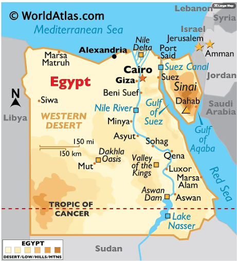 - Major river– Nile River: The longest river in the world, flowing from south to north through Egypt.