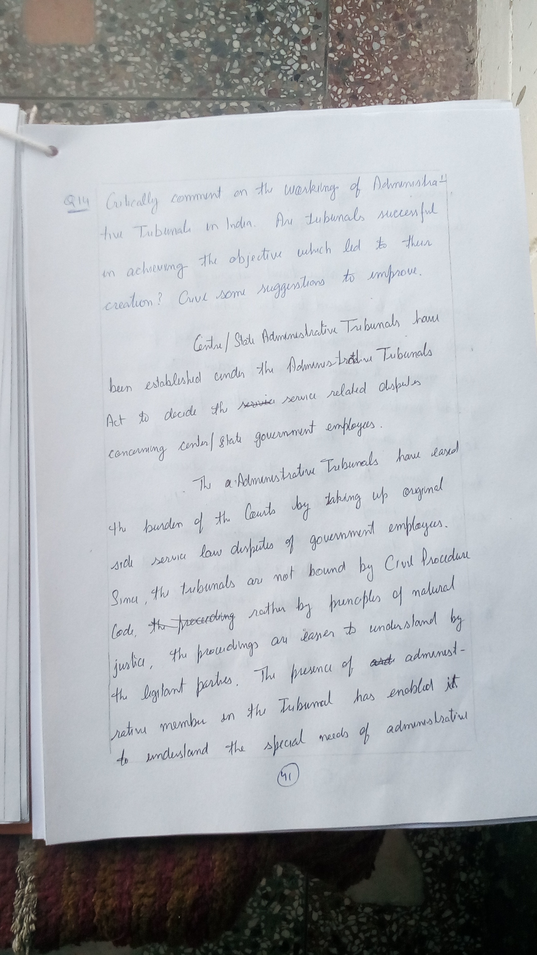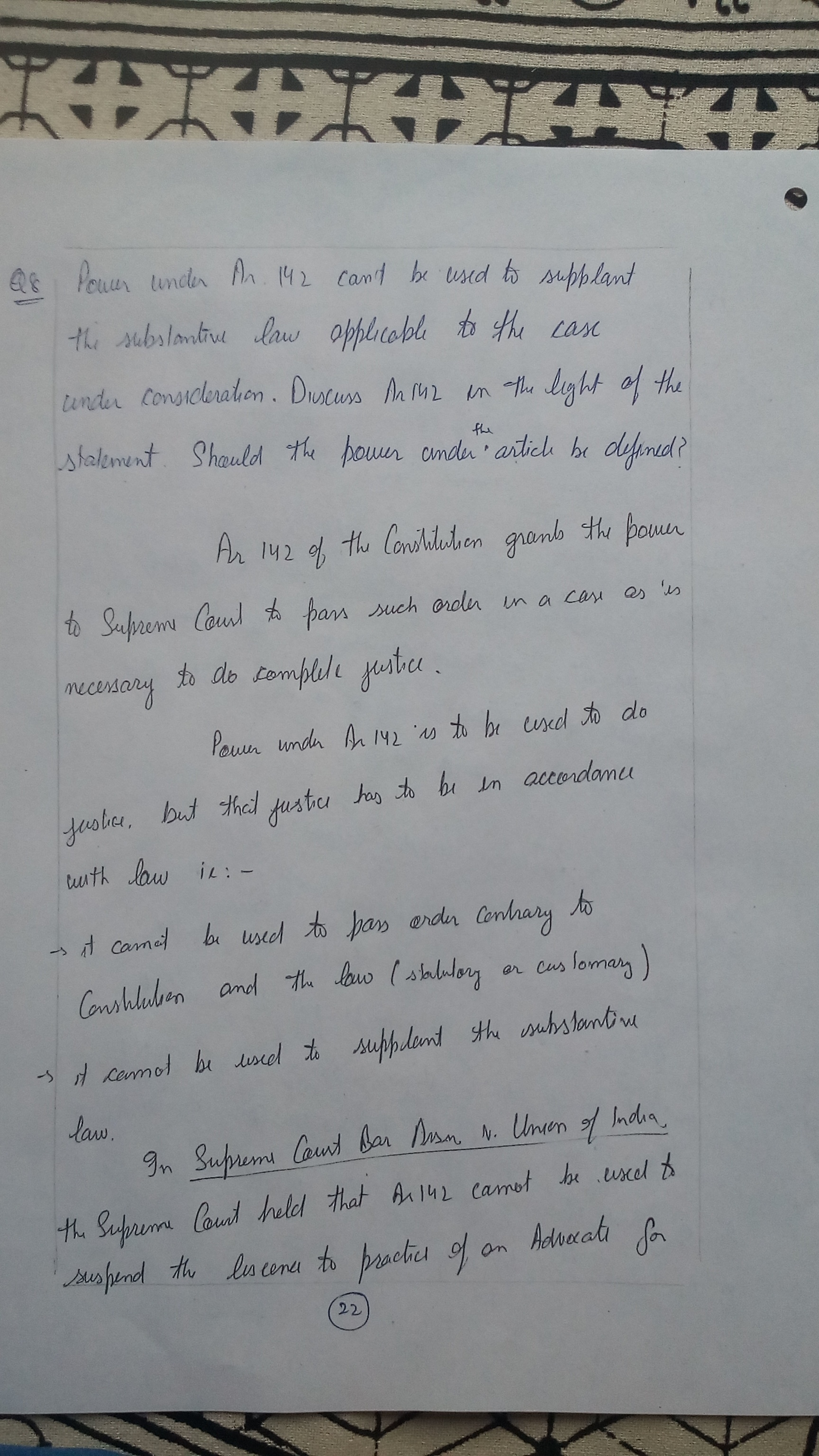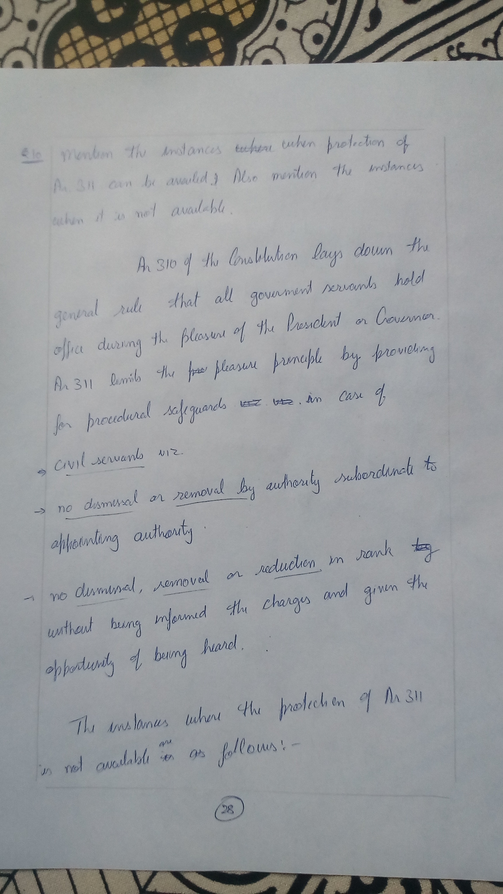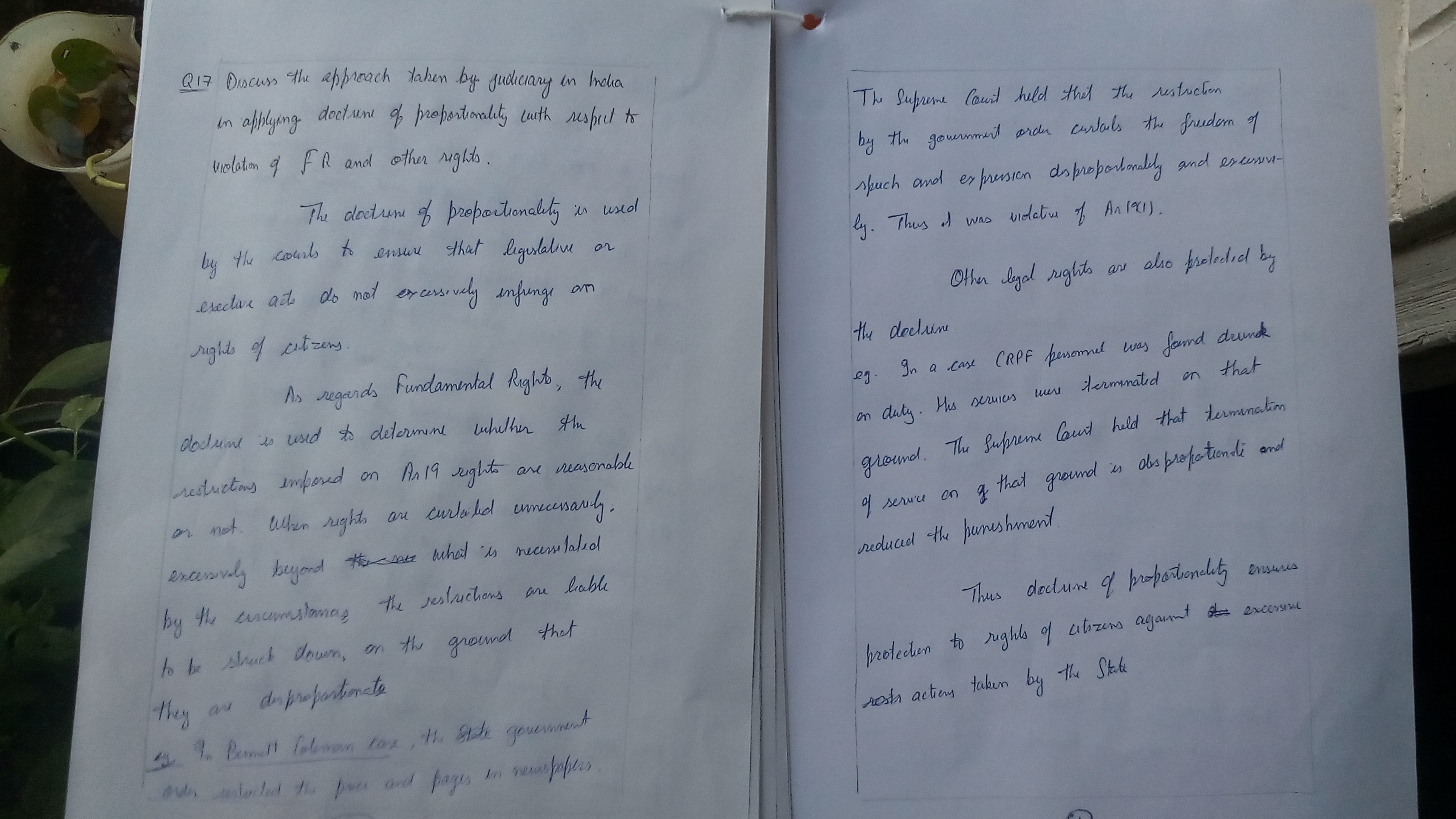 Q7- The power to make law includes the power to make law prospectively and retrospectively. Discuss the scope and limitation of this power. Q8 -Power under article 142 can’t be used to supplant the substantive law applicable to the case or case under consideration.Discuss article 142 in the light of the statement. Should the power under article be defined? Q9 – What are parliamentary privileges? Discuss the need to codify the privileges. Q10- Mention the instances when protection of article 311 can be availed. Also, mention the instances when it is not available? Q11- Doctrine of pleasure in India is not absolute. Discuss. Explain how Doctrine of pleasure as developed in England has not been accepted in full in India. Q12- Do we need to abolish article 311? Critically examine. Q13- The concept of reasonable opportunity to defend is synonyms with natural justice. Explain. Mention the exceptions to the rule of reasonable opportunity to defend. Q14-Critically comment up on the working of administrative tribunal in India. Are tribunals successful in achieving the objective which led to their creation? Give some suggestions to improve. Q15- Legitimate expectation is different from mere anticipation,desire and hope. Explain. Q16- Bottlenecks in fiscal federalism are the main problems of Central state relations in India. Discuss. Q17- Discuss the approach taken by judiciary in India in applying doctrine of proportionality with respect to violation of F.R and other rights. Q18- To apply legitimate expectation doctrine, it needs something more than mere a claim. Substantiate. Q19- Concept of constructive trust is the force behind public accountability doctrine.