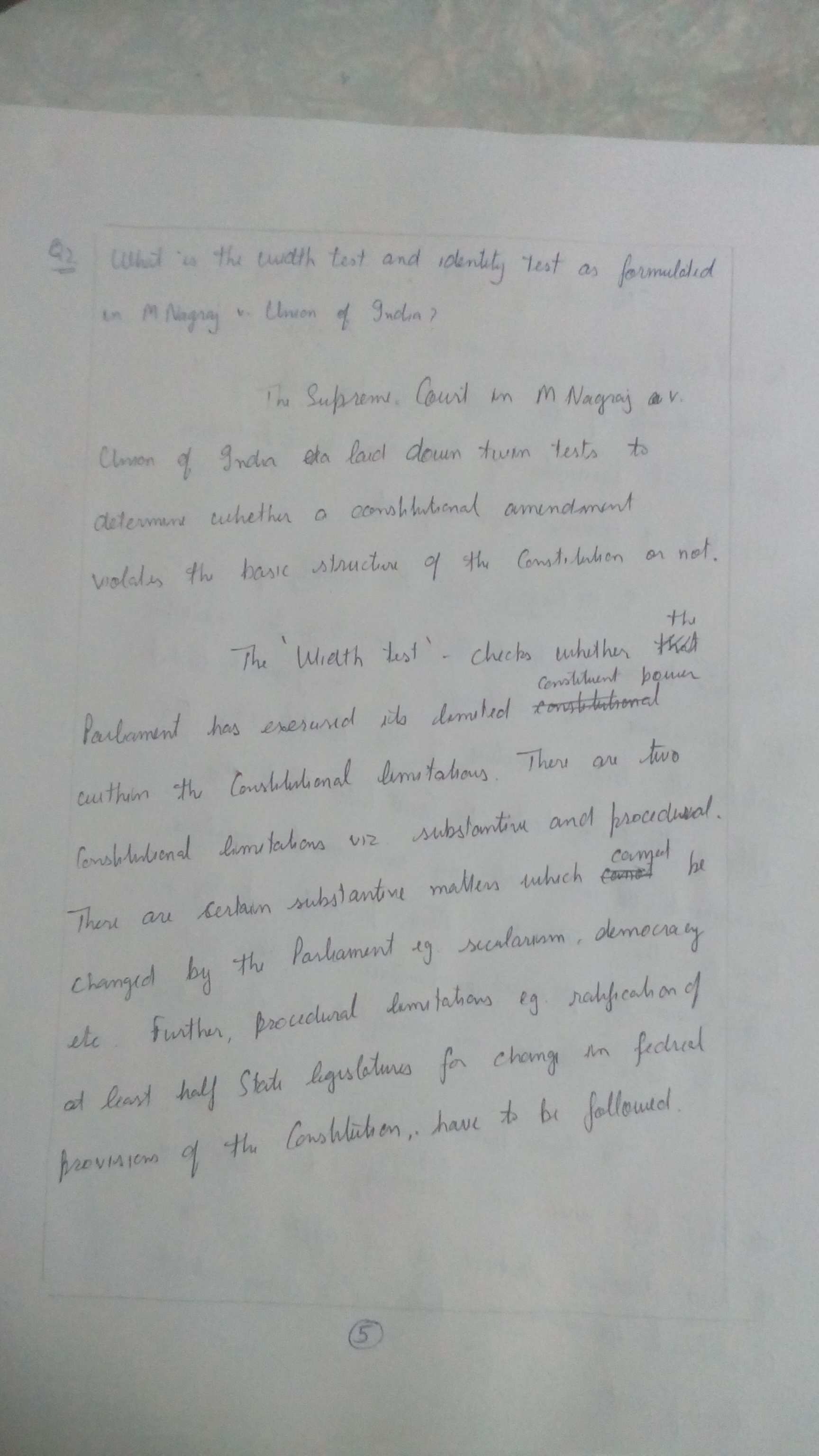 Q1-In a democracy, the public also has the right to speak freely about the exercise of power, which must include the freedom to criticize the judicial system and the judiciary. In the light of the above statement, critically examine the contempt power in India. Give some suggestions to establish a balance between Right to Freedom and Expression and use of Contempt power. Q2- What is width test and identity test as formulated in M Nagaraj v. Union of India? Q3- Discuss the controversy related with the amendment of the Fundamental Rights. Q4-The satisfaction of the President under article 352 is though subjective but not beyond scrutiny. Comment. Q5- 44th amendment to the article 352 has minimized the chances of abuse of power in relation to declaration of emergency. Explain. Q6- Discuss the doctrine of colourable legislation. Also,mention the limitations of it.