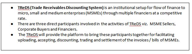 - All companies with a turnover more than Rs. 500 crore, must now compulsorily be brought on the Trade Receivables e-Discounting System (TReDS).
