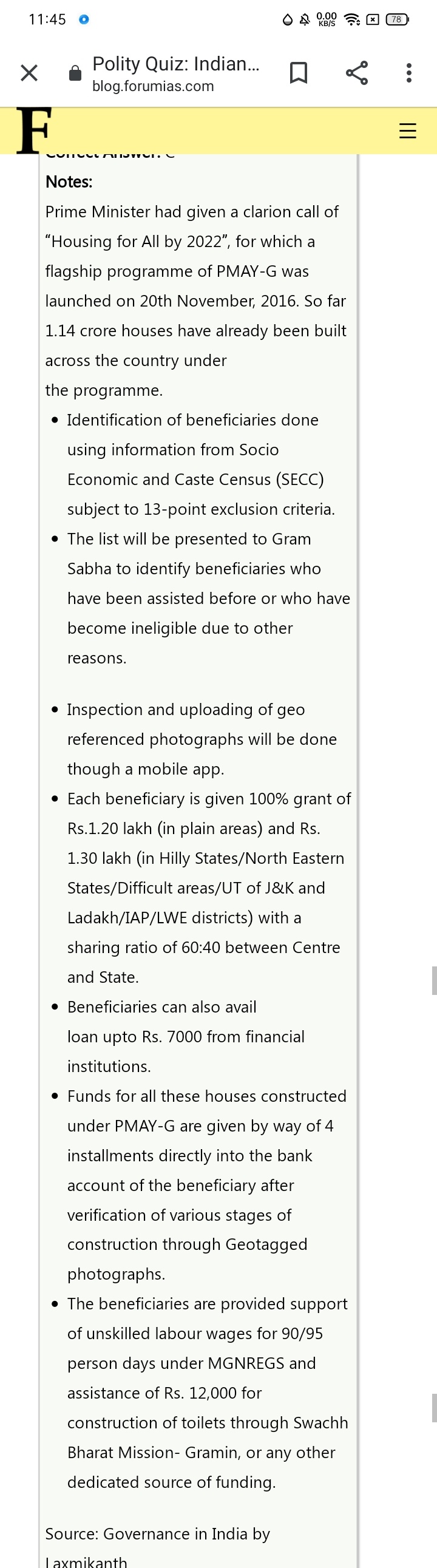 *Prime Minister had given a clarion call of “Housing for All by 2022”, for which a flagship programme of PMAY-G was launched on 2016. Each beneficiary is given 100% grant of Rs.1.20 lakh (in plain areas) and Rs. 1.30 lakh (in Hilly States/North Eastern States/Difficult areas/UT of J&K and Ladakh/IAP/LWE districts) with a sharing ratio of 60:40 between Centre and State. Fund in 4 installment.
