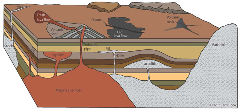 The near horizontal bodies of the intrusive igneous rocks are called sill or sheet, depending on the thickness of the material. The thinner ones are called sheets while the thick horizontal deposits are called sills.