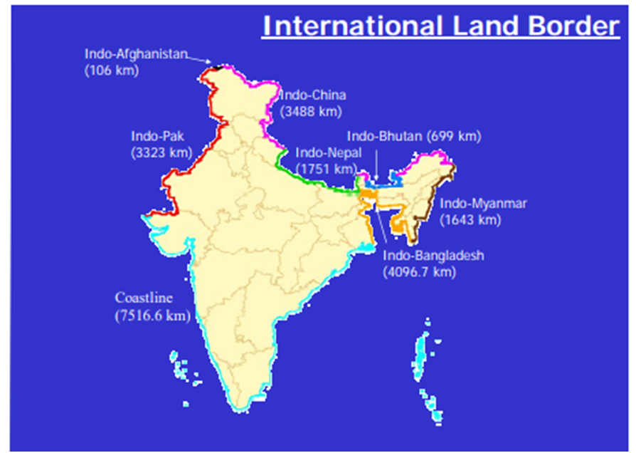 India has 15,106.7 Km of land border and a coastline of 7,516.6 Km including island territories. The length of our land borders with neighboring countries is as under: