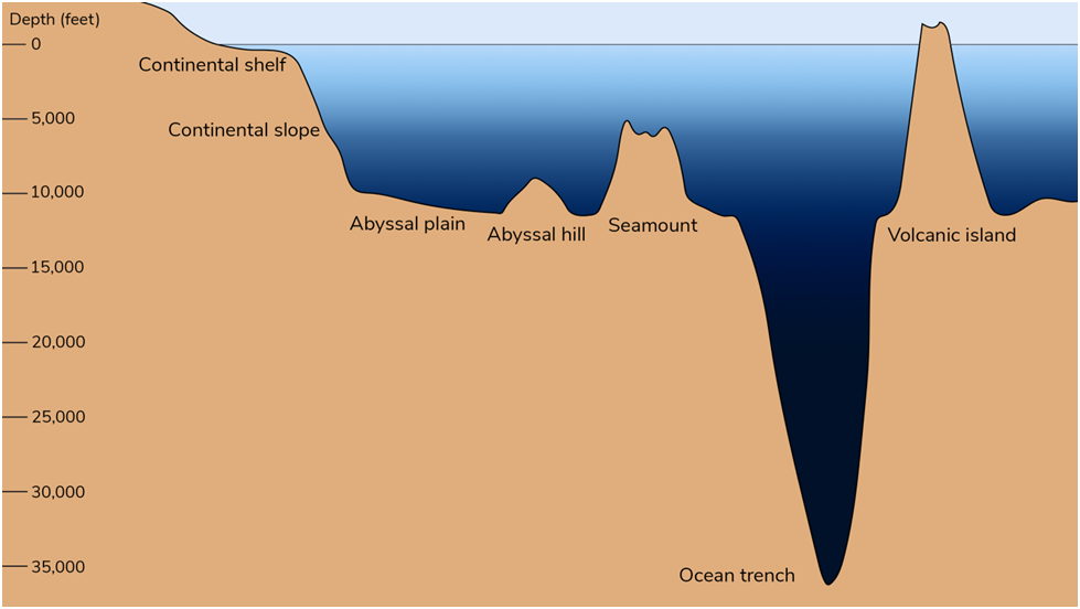 [A] Continental shelf, continental slope, continental rise, abyssal plain