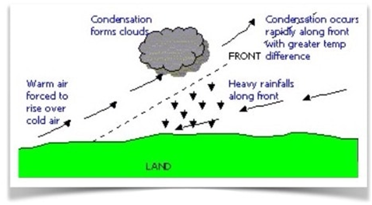 Frontal (or Cyclonic) Rain is caused by cyclonic activity and it occurs along the fronts of the cyclone. It is formed when two masses of air of different temperature, humidity and density meets.