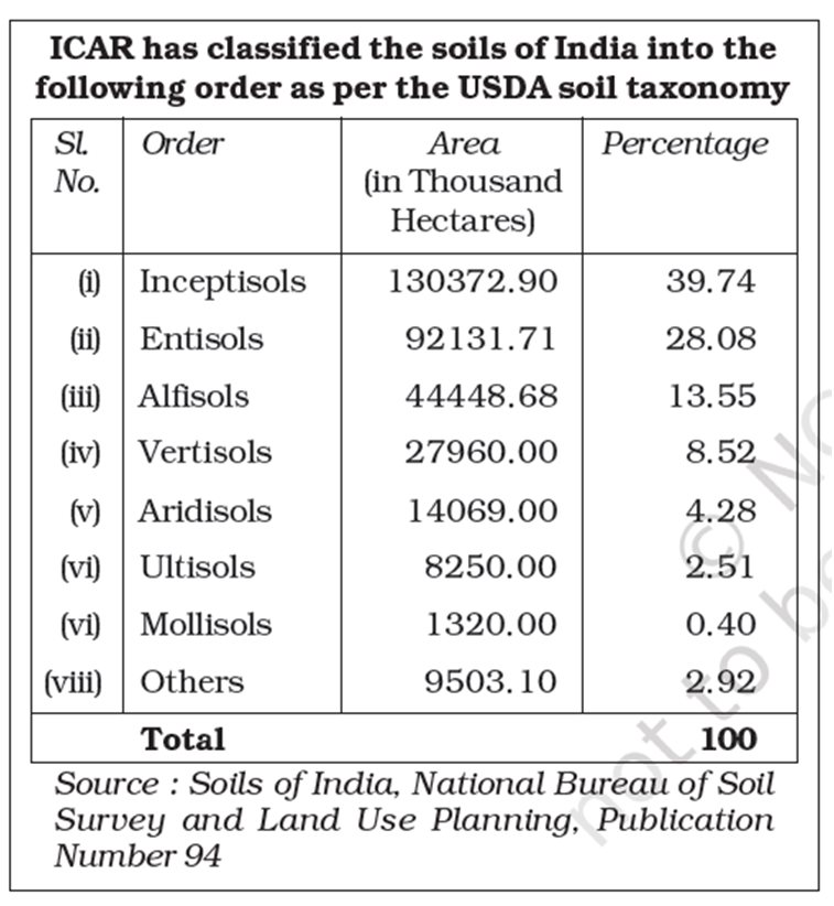 Q. Which of the following order of soil classification covers the maximum of India’s area?