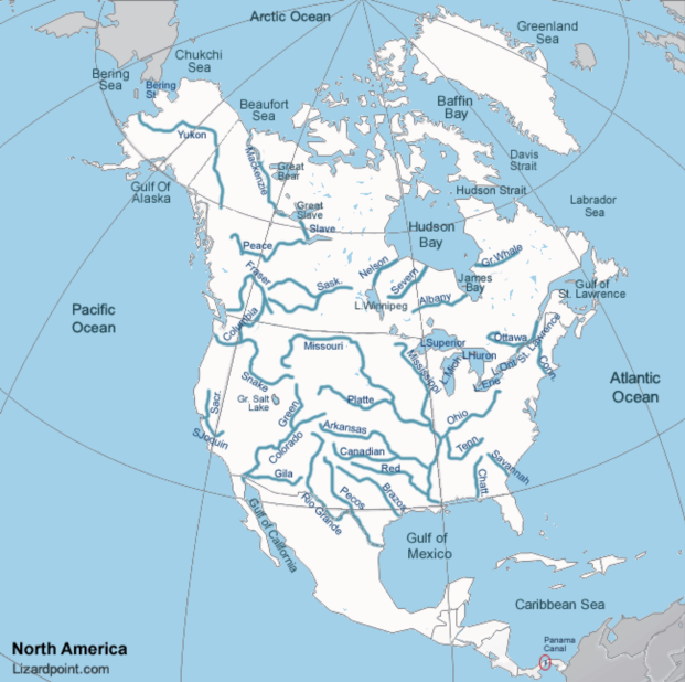 Mississippi River drains its water in Gulf of Mexico. Gila river is a tributary of Colorado river and their water drains into Pacific Ocean.