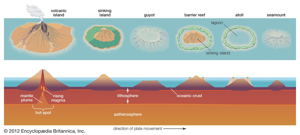 A seamount is a mountain that rises from the ocean floor; a submerged flat-topped seamount is termed a guyot. By arbitrary definition, seamounts must be at least 3000 ft (about 900 m) high, but in fact there is a continuum of smaller undersea mounts, down to heights of only about 300 ft (100 m). Some seamounts are high enough temporarily to form oceanic islands, which ultimately subside beneath sea level. There are on the order of 10,000 seamounts in the world ocean, arranged in chains (for example, the Hawaiian chain in the North Pacific) or as isolated features. In some chains, seamounts are packed closely to form ridges (for example, the Walvis Ridge in the South Atlantic). Very large oceanic volcanic constructions, hundreds of kilometers across, are called oceanic plateaus (for example, the Manihiki Plateau in the South Pacific).
