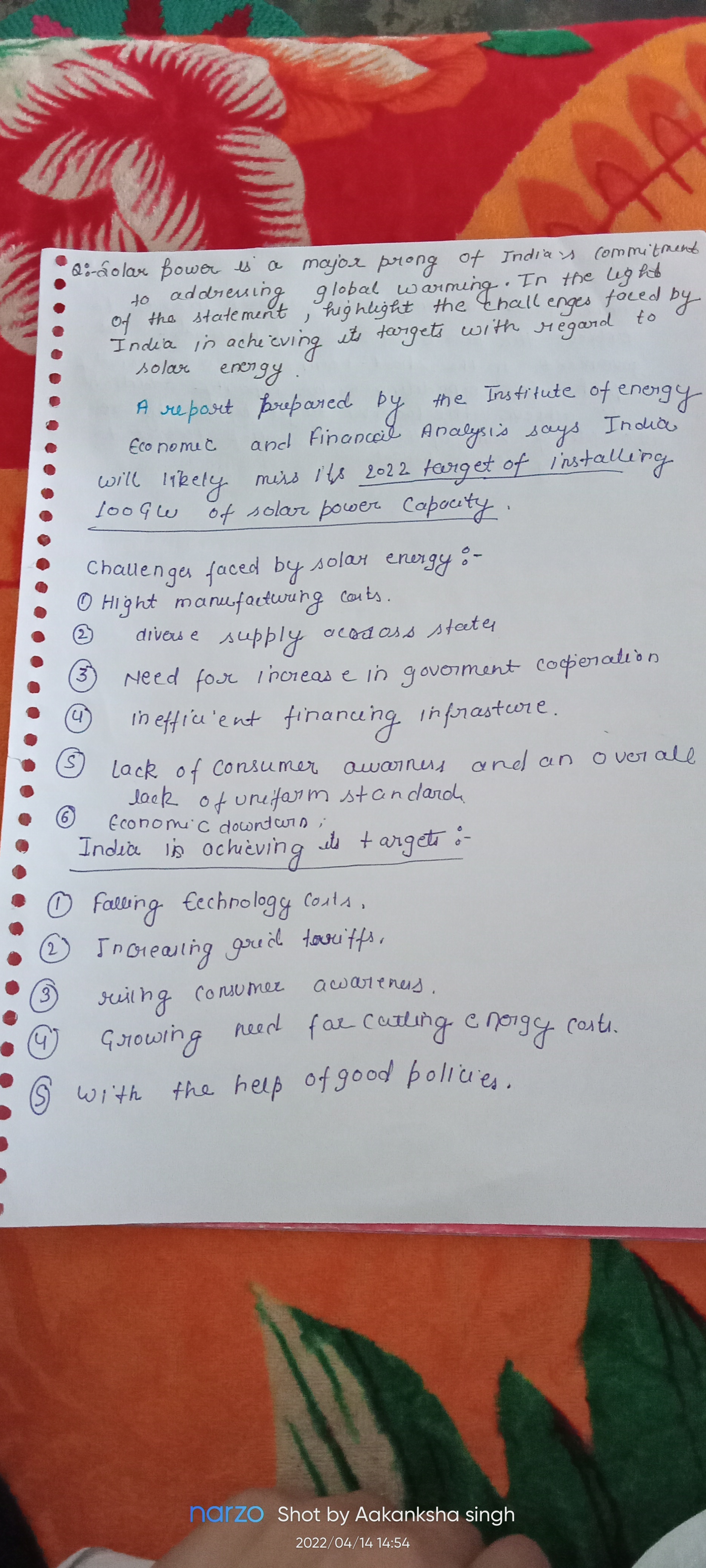 2.) Solar power is a major prong of India’s commitment to addressing global warming. In the light of the statement, highlight the challenges faced by India in achieving its targets with regard to solar energy.