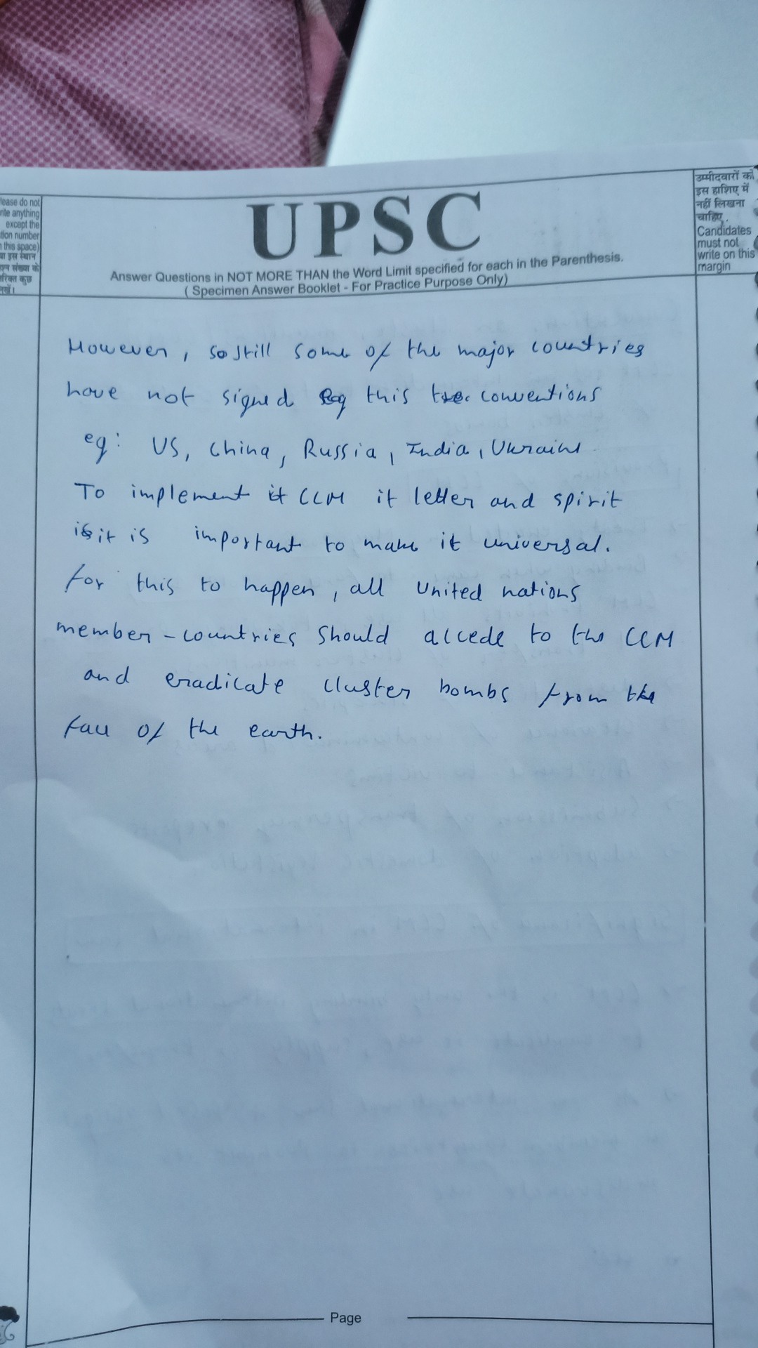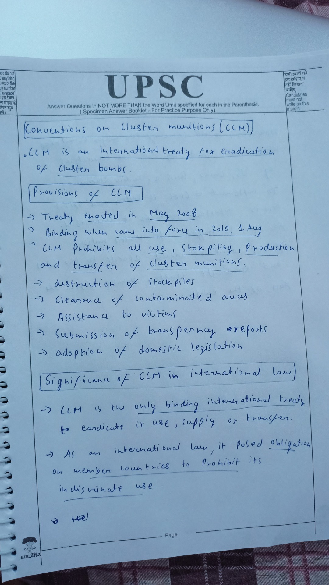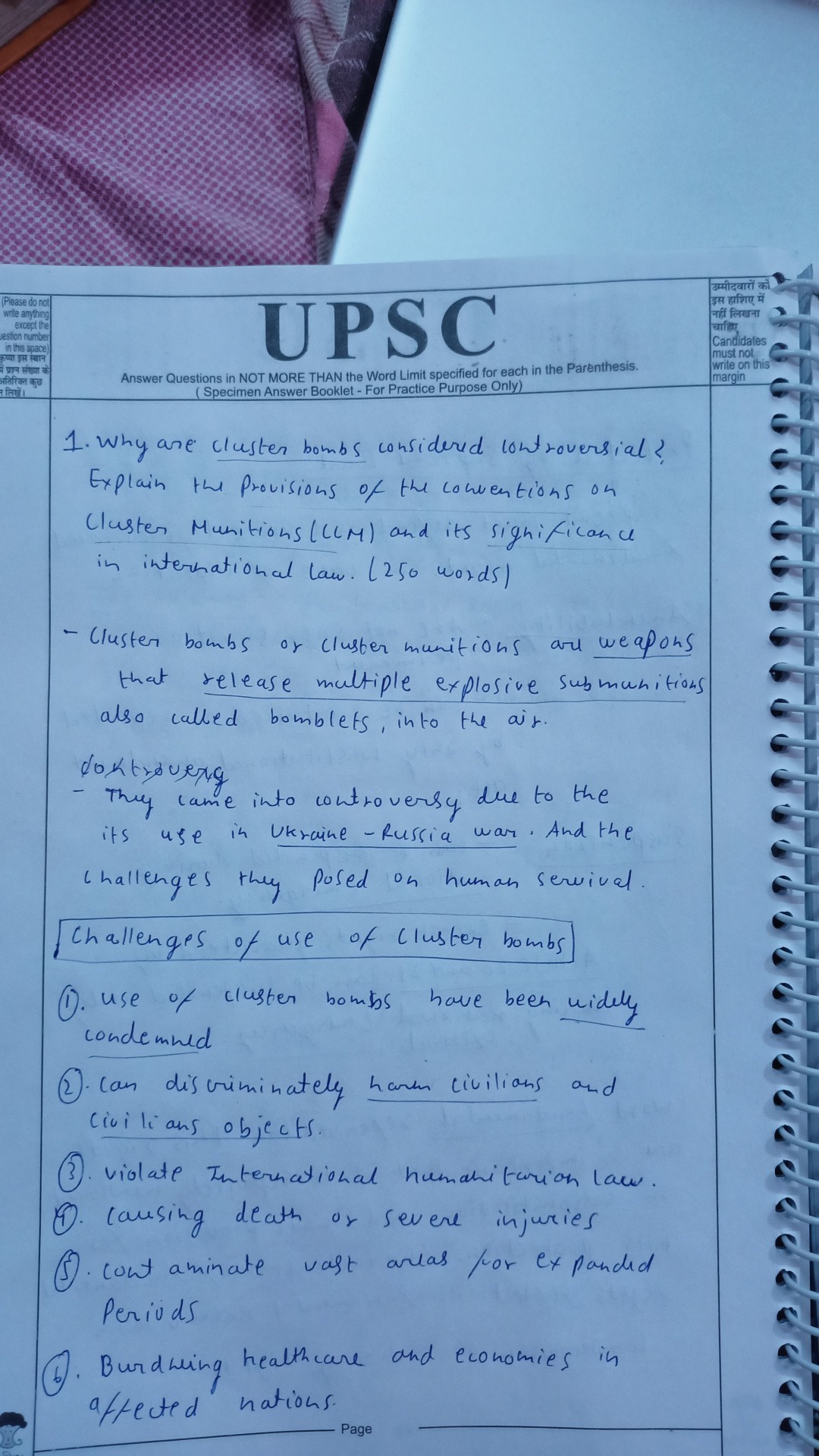 1) Why are cluster bombs considered controversial? Explain the provisions of the Convention on Cluster Munitions (CCM) and its significance in international law. (250 words)