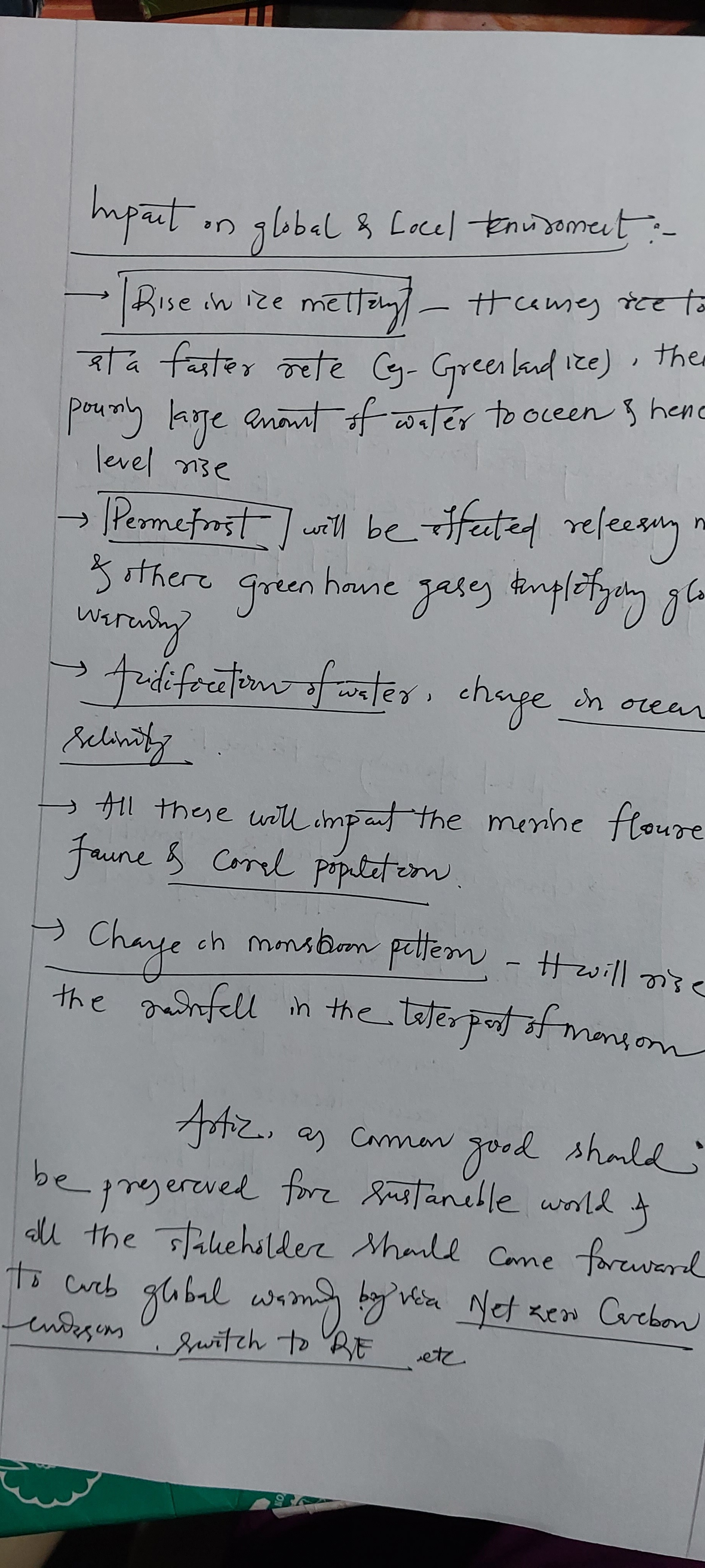 Only missing point is the rise in sea levels and resulting disaster (like submergence of low-lying islands, coastal cities, climate induced migration etc.). Can add ‘positive feedback’ loop also, preferably after ‘ice-albedo’ feedback.