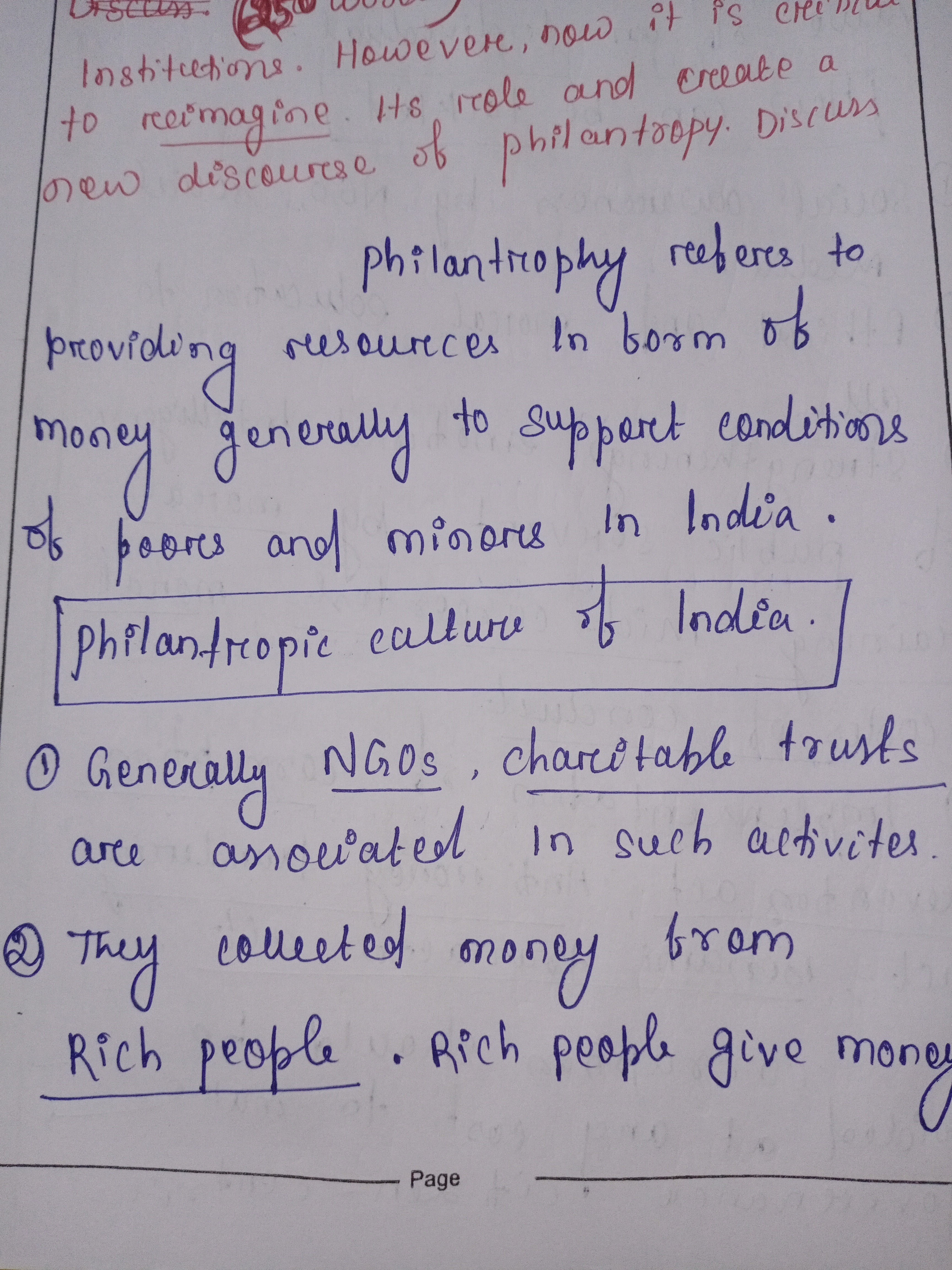 2) India has had a rich culture of philanthropy, primarily through social networks and religious institutions. However, now it is critical to reimagine its role and create a new discourse of philanthropy. Discuss.