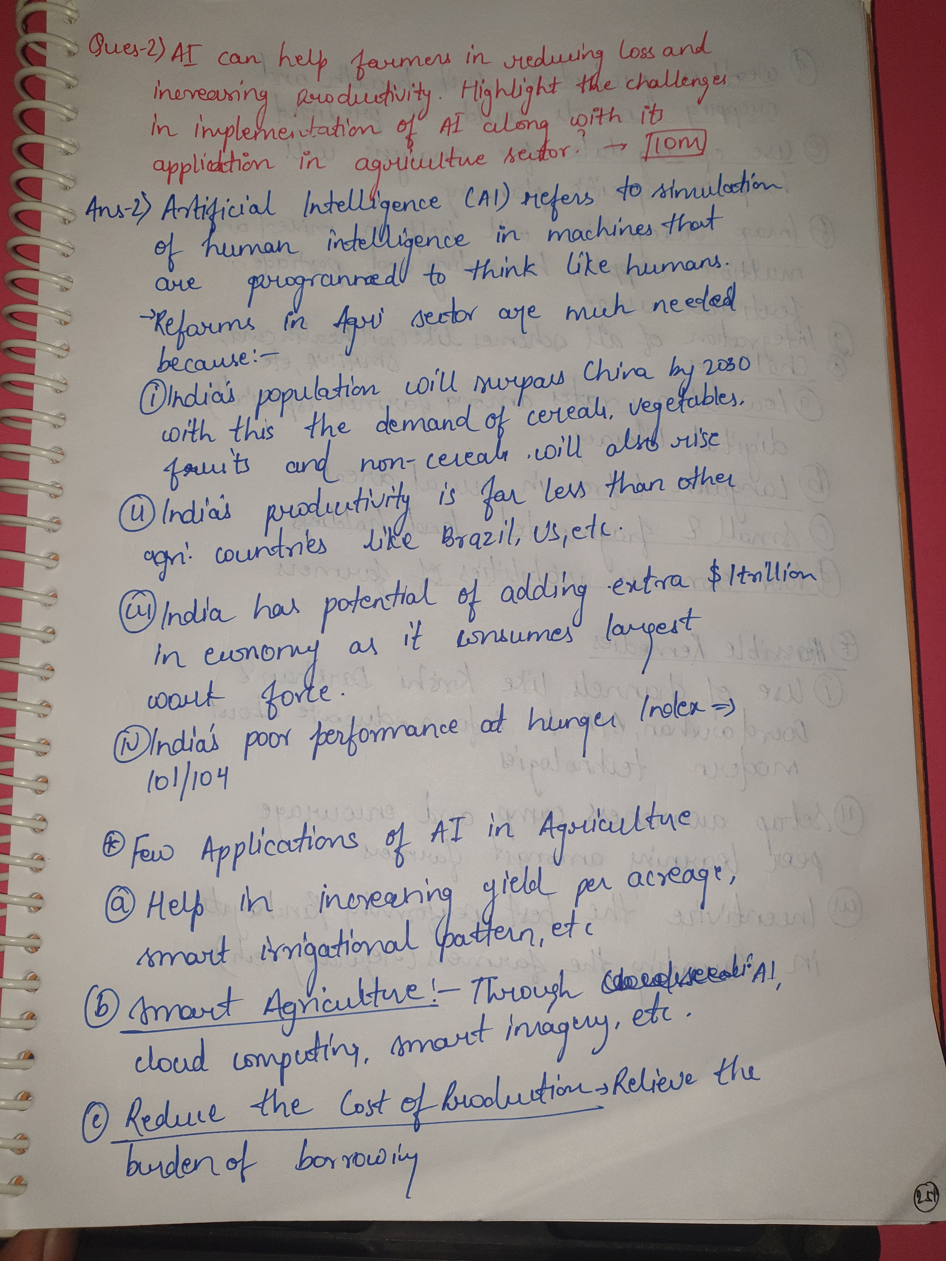 2) Artificial Intelligence powered solutions can enable farmers to do more with less and improve farm productivity. In the light of the statement, highlight the applications of AI for agriculture and discuss the challenges in its adoption and implementation.