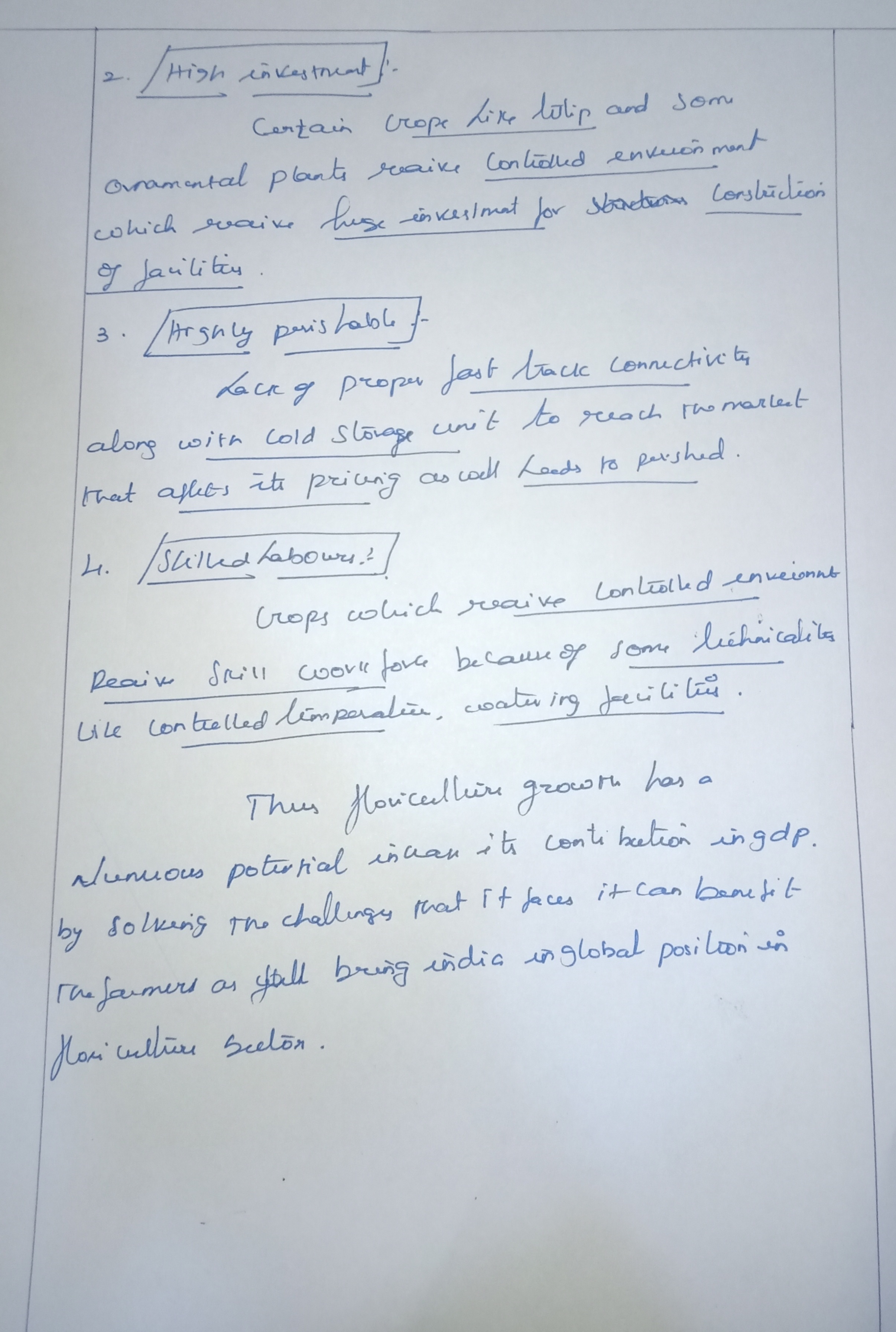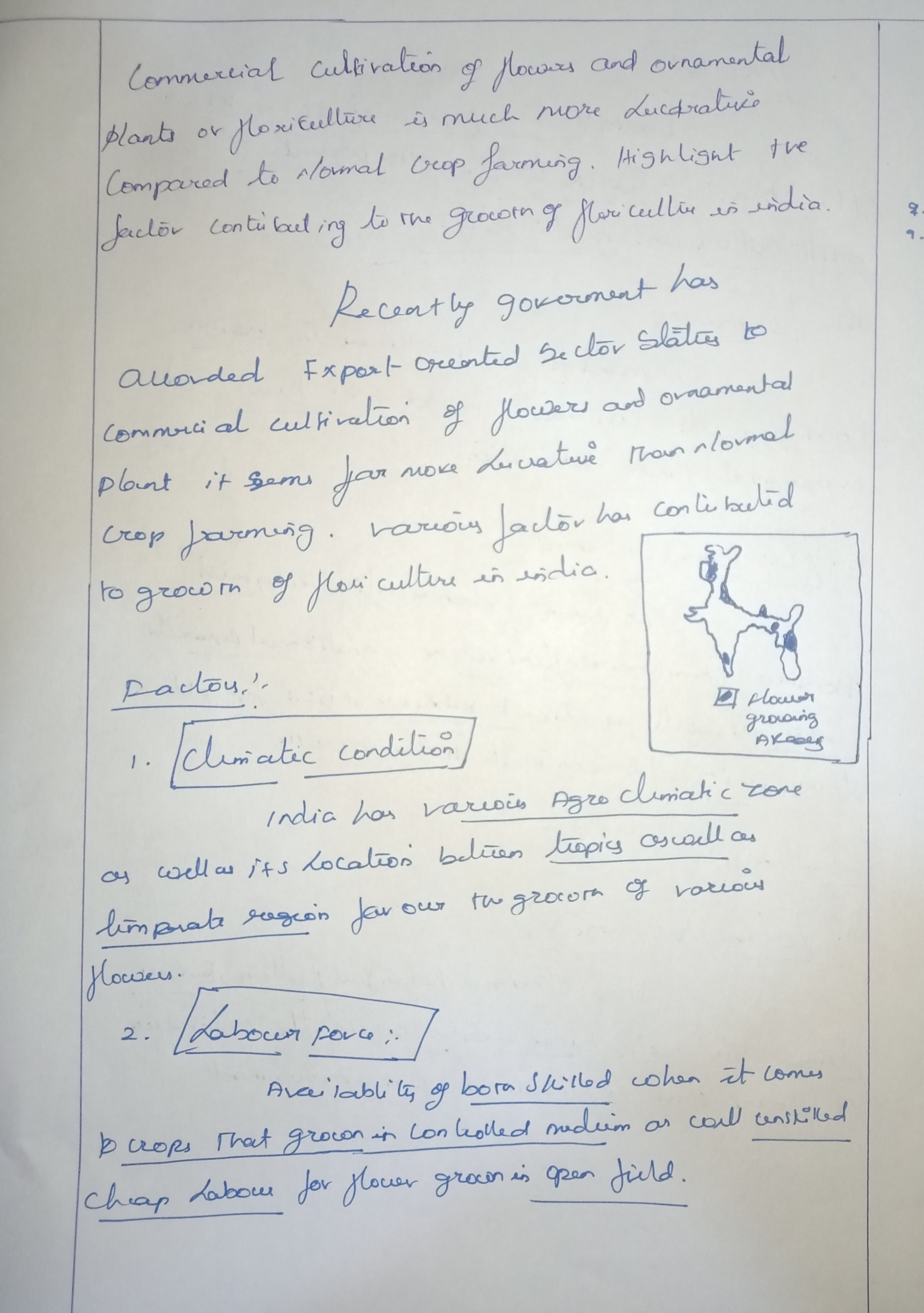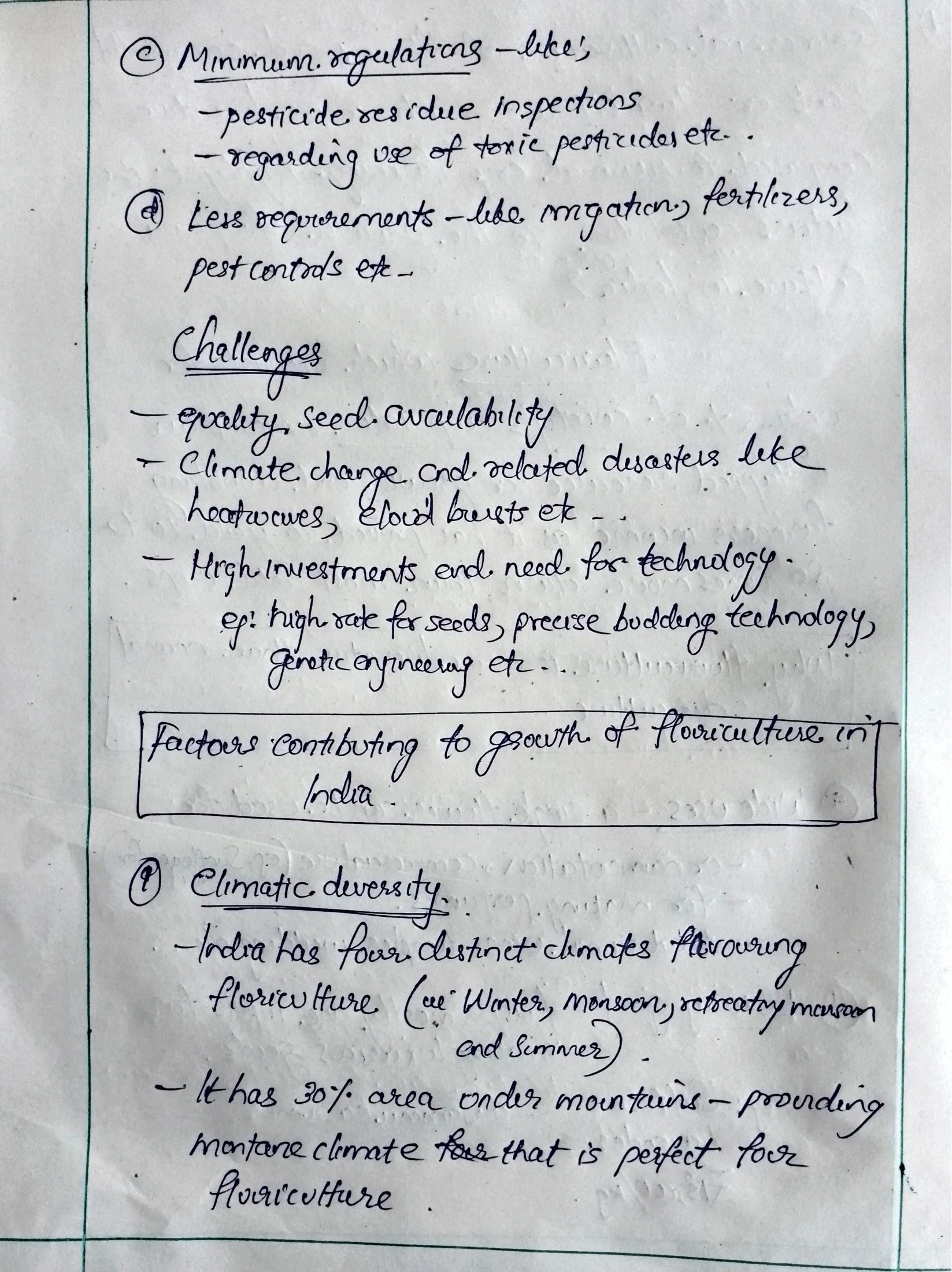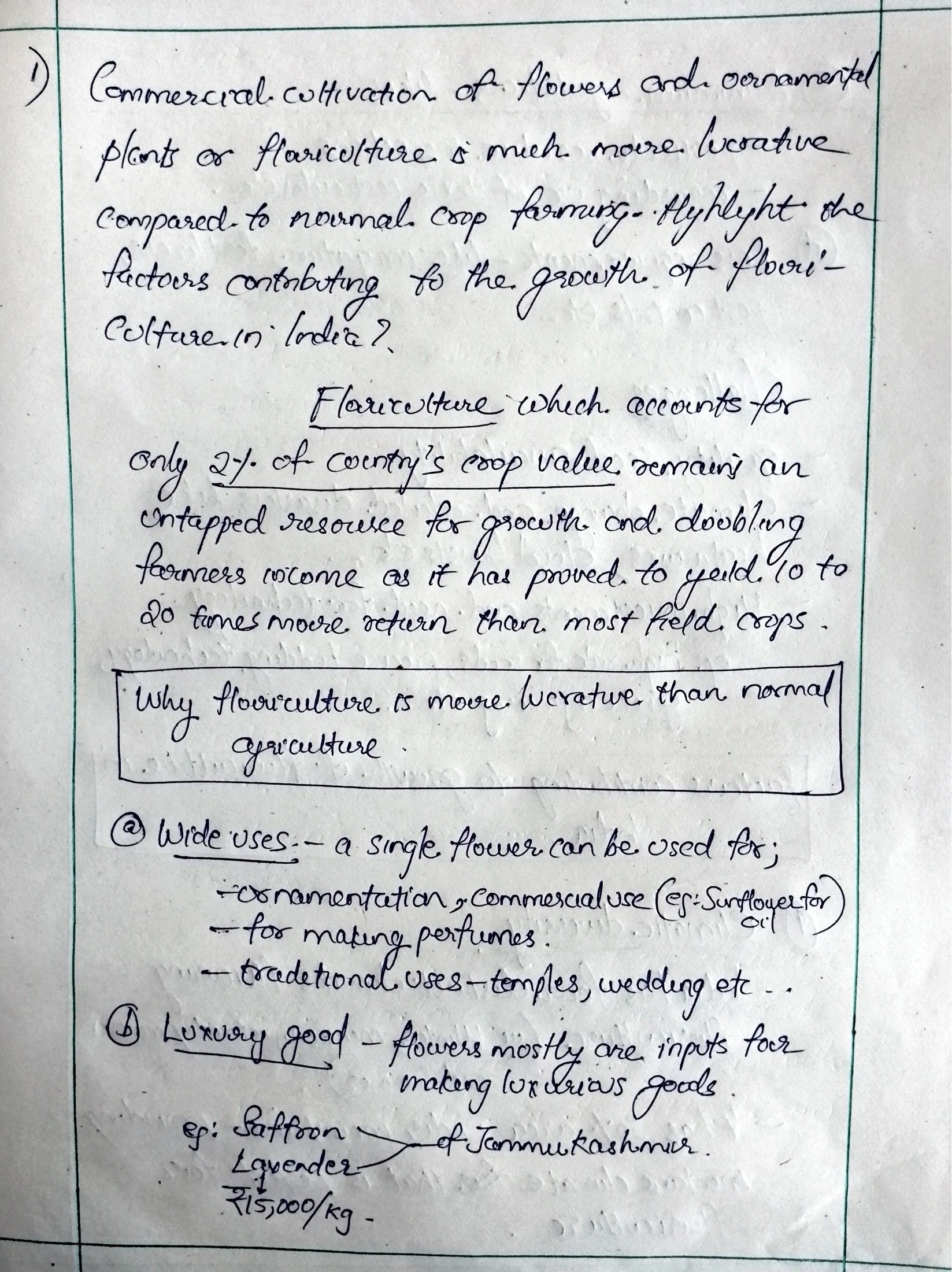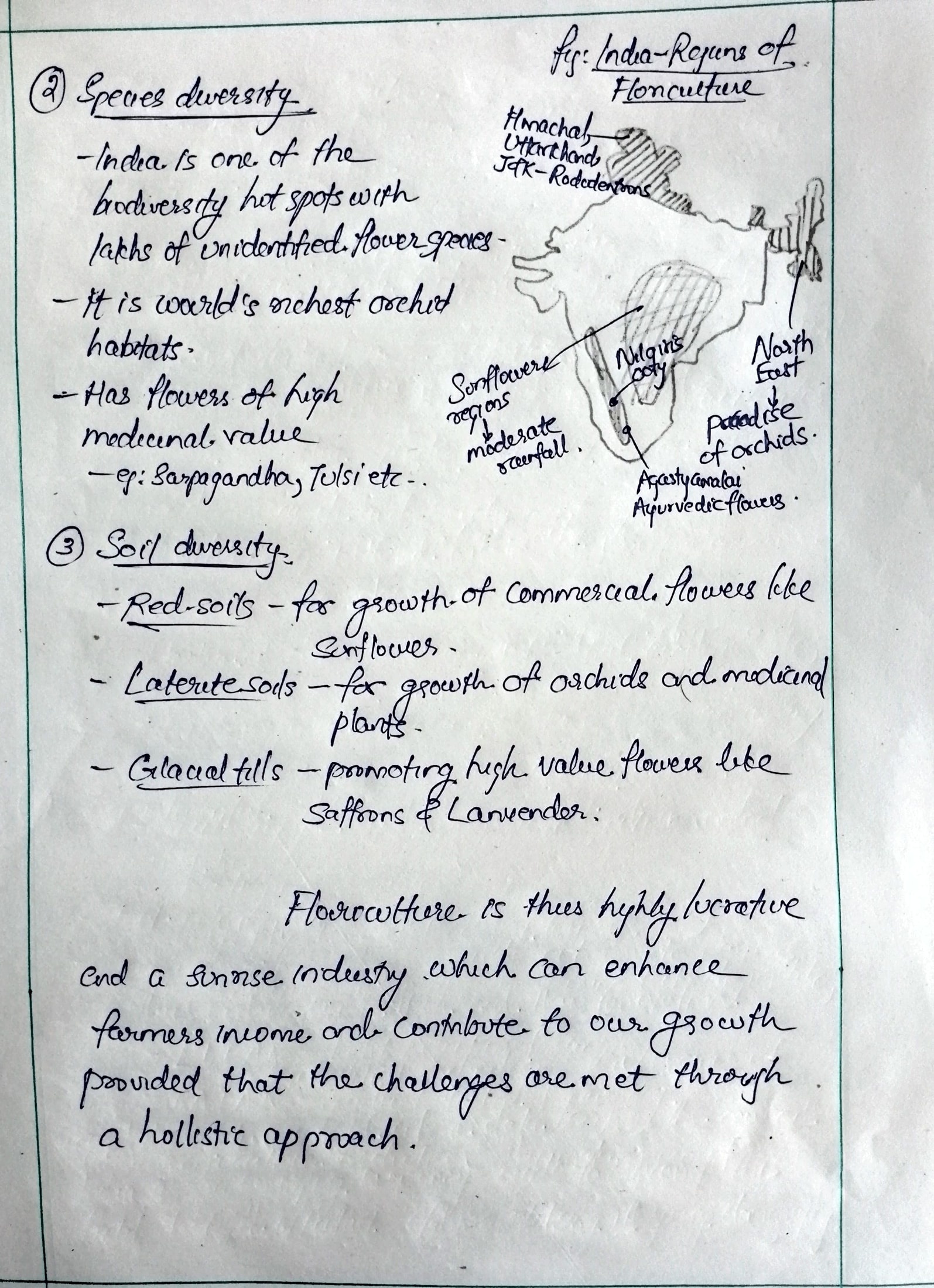 Great answer! One thing in my opinion that can be changed is the latter part of the answer. It seems more appropriate for Geography optional. The points mentioned under lucrative agriculture are the contributing factor in growth of floriculture as well. Points related to climate, species, soil diversity etc. can be clubbed as single point ‘Geographical factors’. (I guess this would be a 10 mark question).