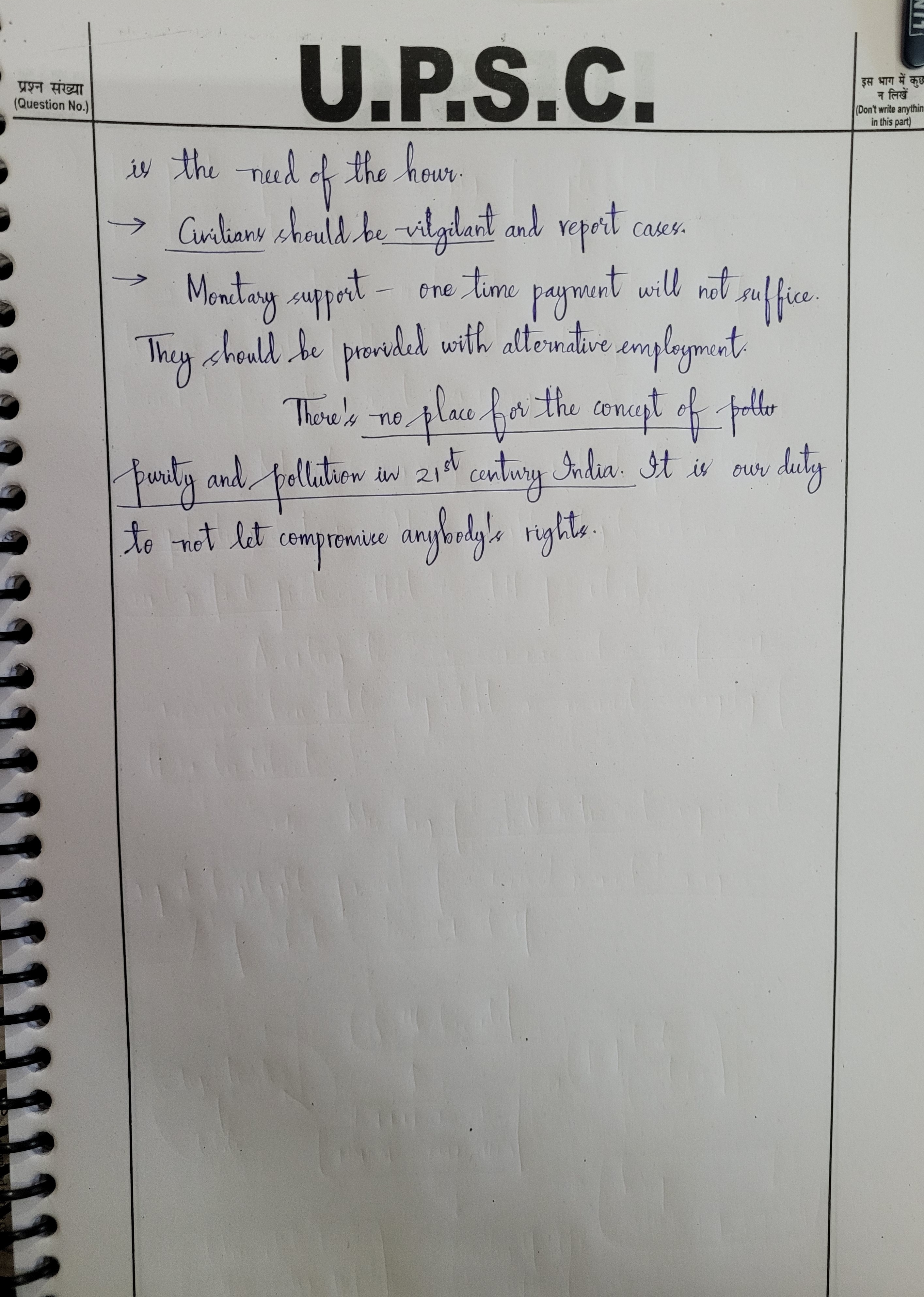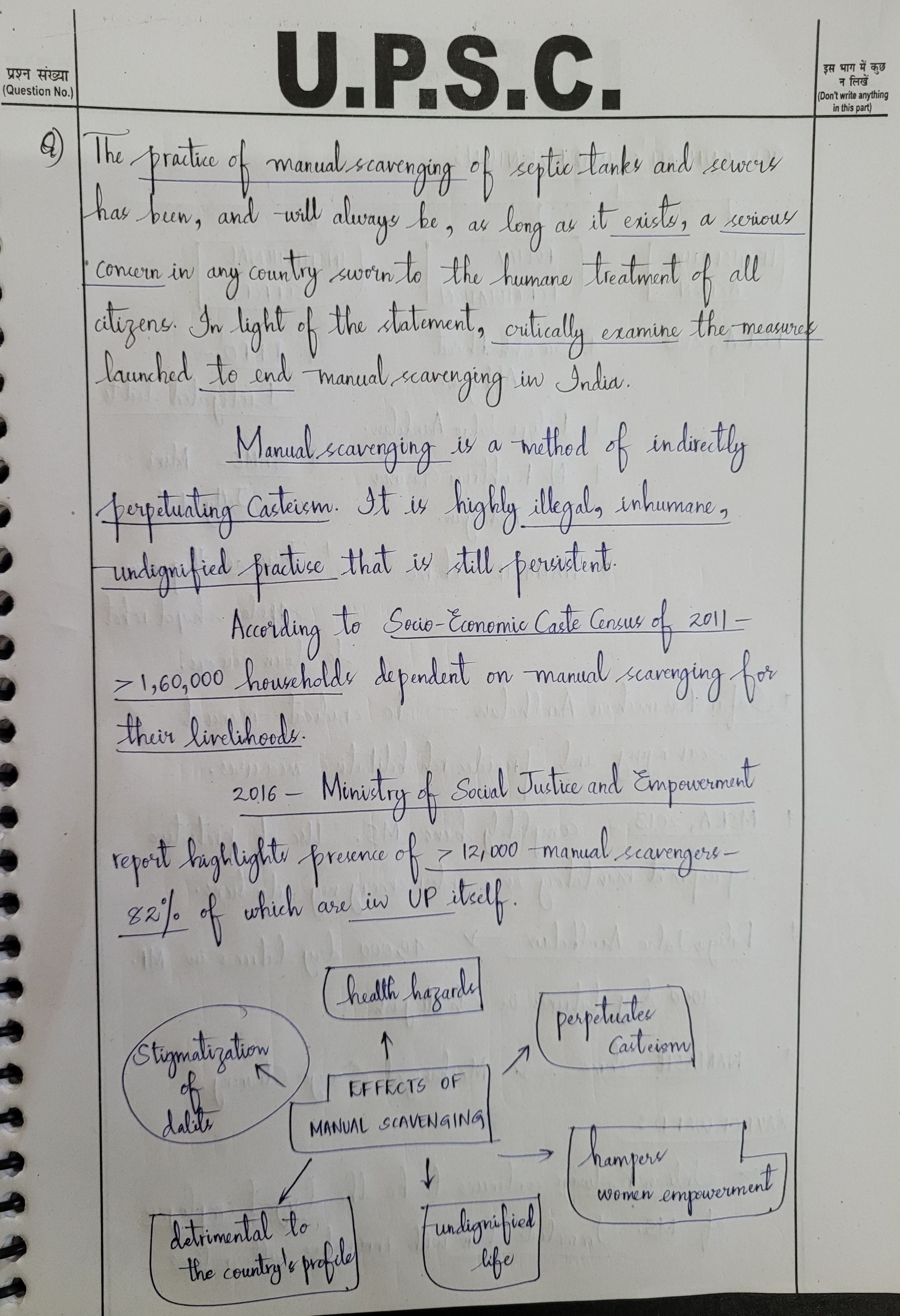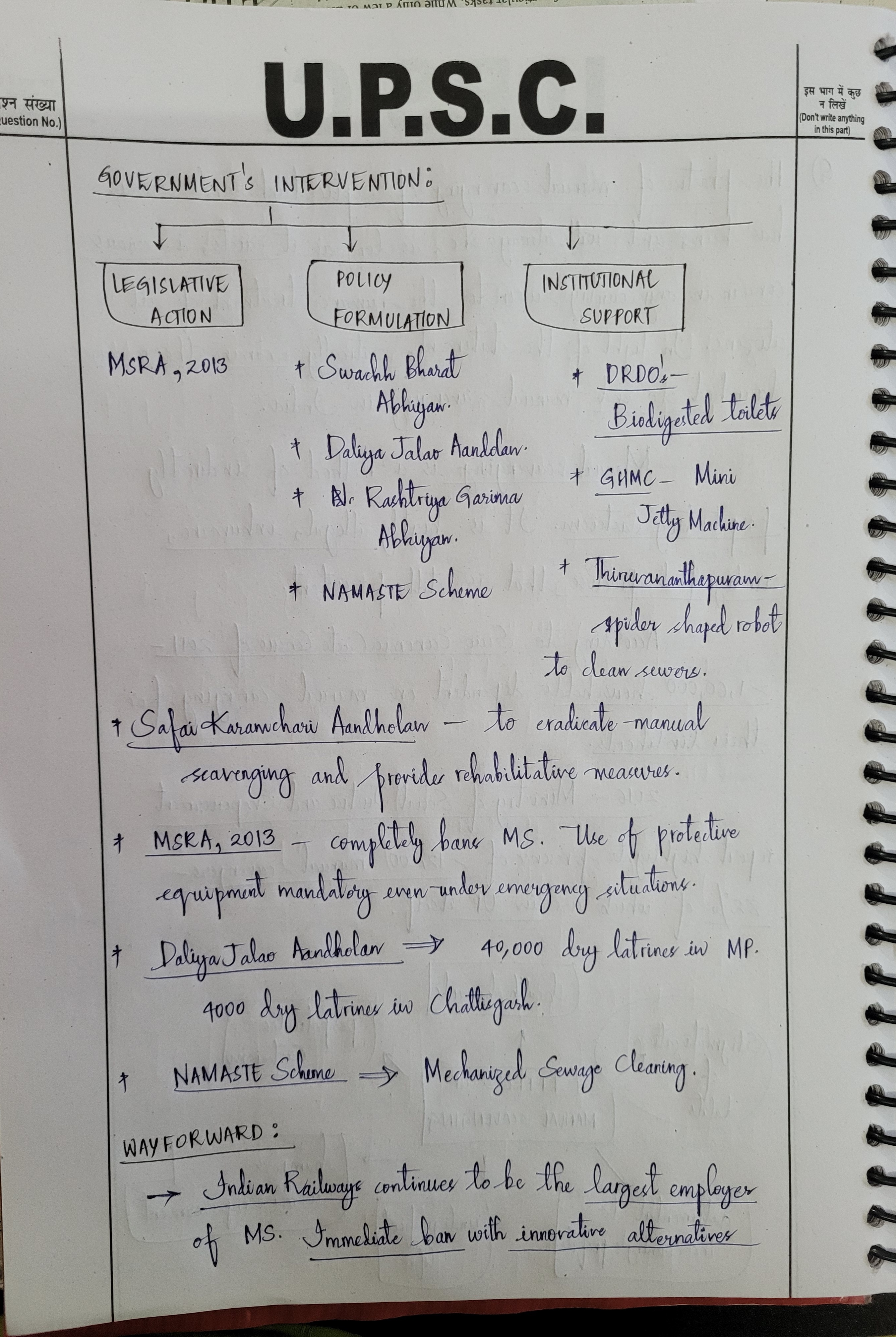 Only shortcoming is that You had to include the criticism of existing provisions especially the poor implementation of the 2013 Act. e.g, You have very correctly mentioned Indian Railways as largest employer of MS, but it should come under shortcomings, not way forward. There are other issues like no penalty on violators etc, compensation not paid, unsanitary septic tanks still exist etc.