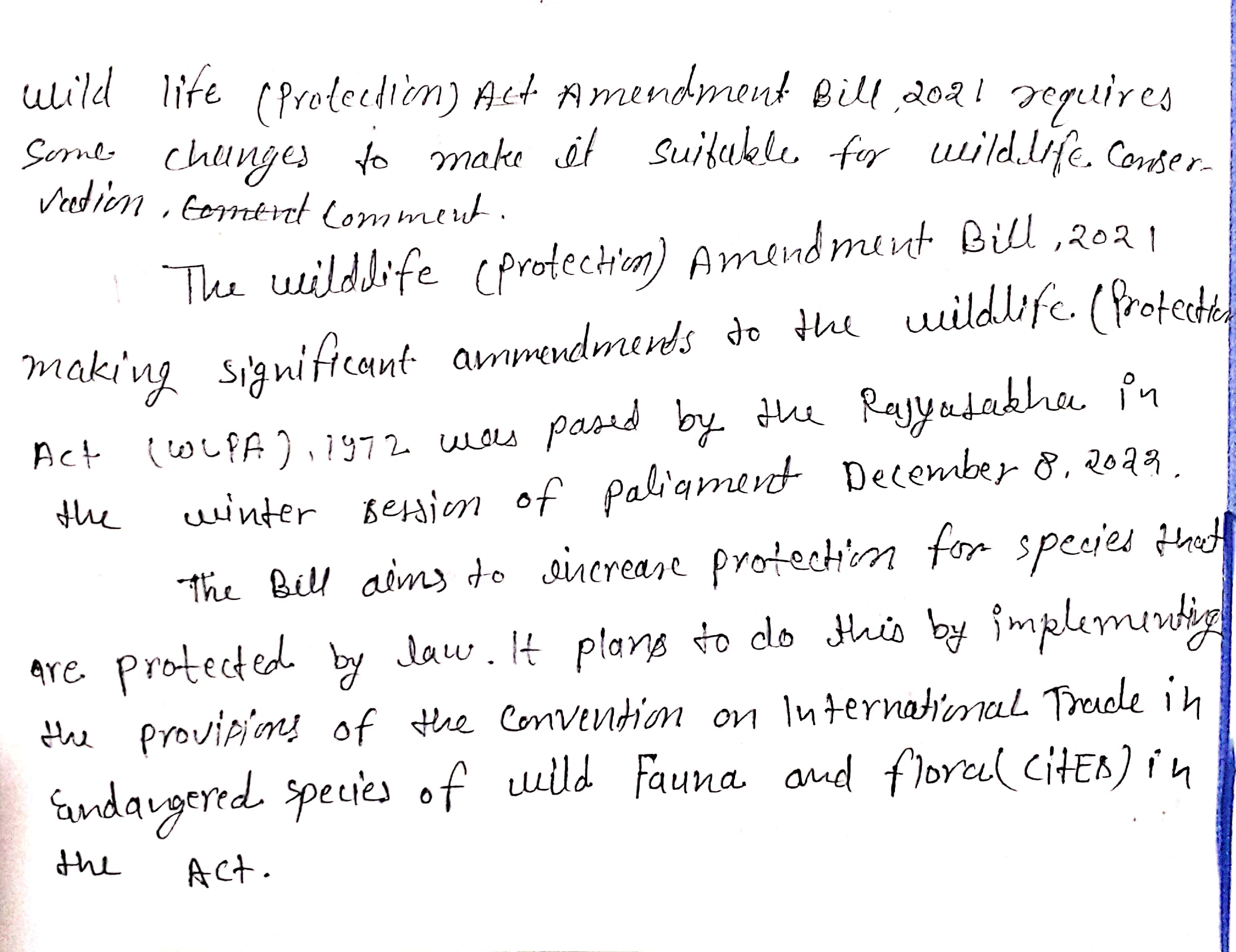 1) Wild Life (Protection) Amendment Bill, 2021 requires some changes to make it more suitable for wildlife conservation. Comment.