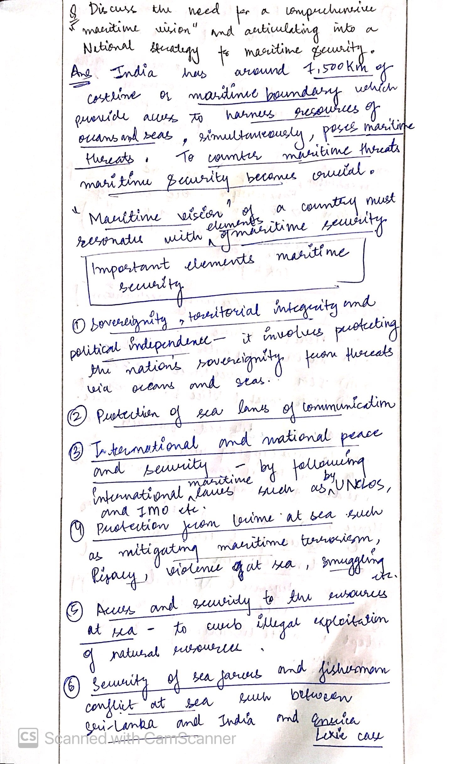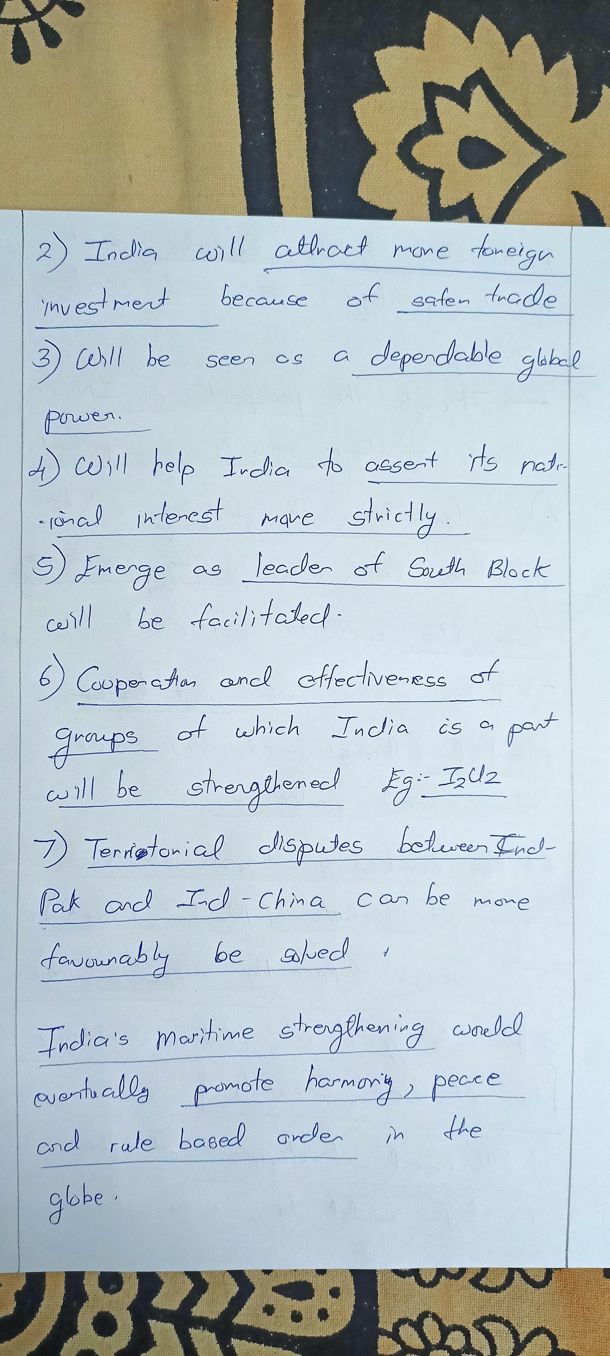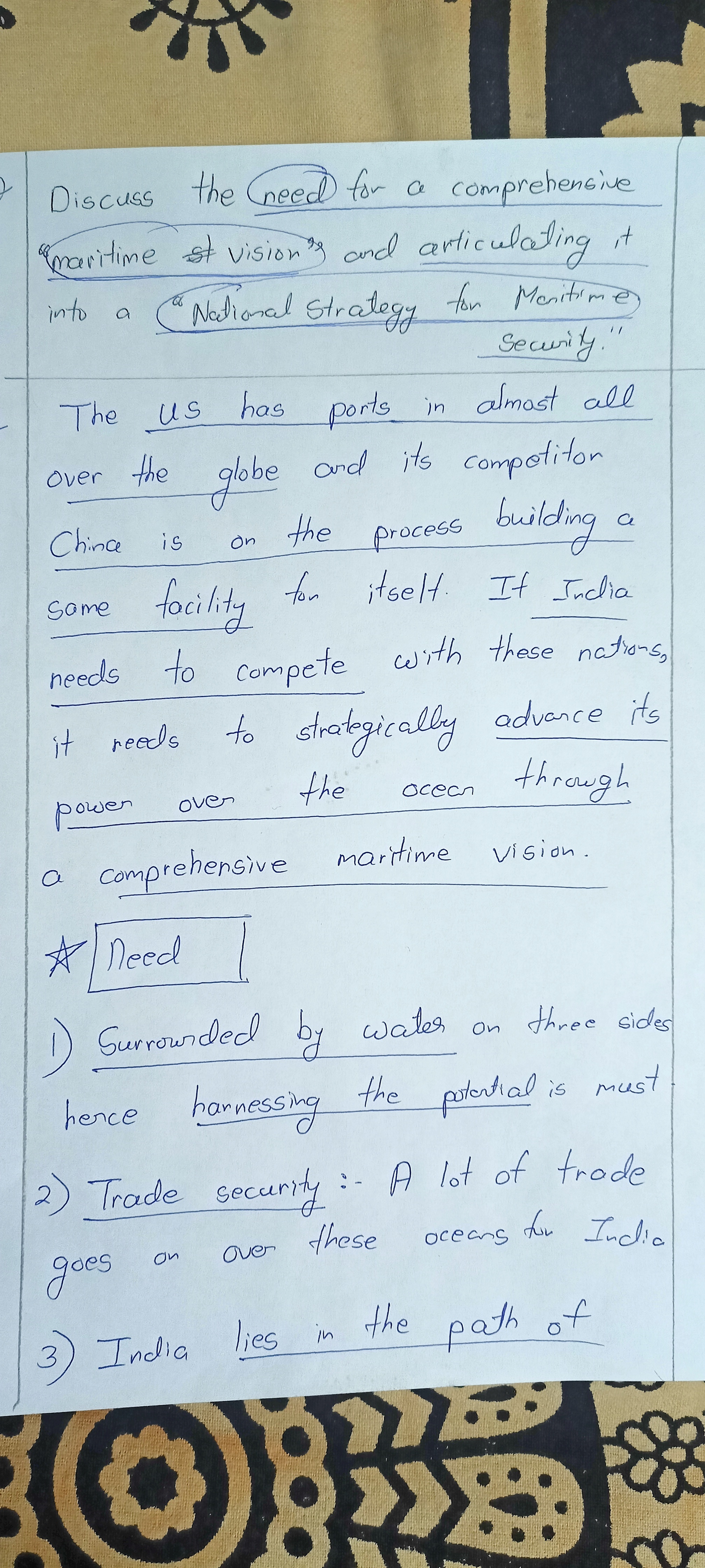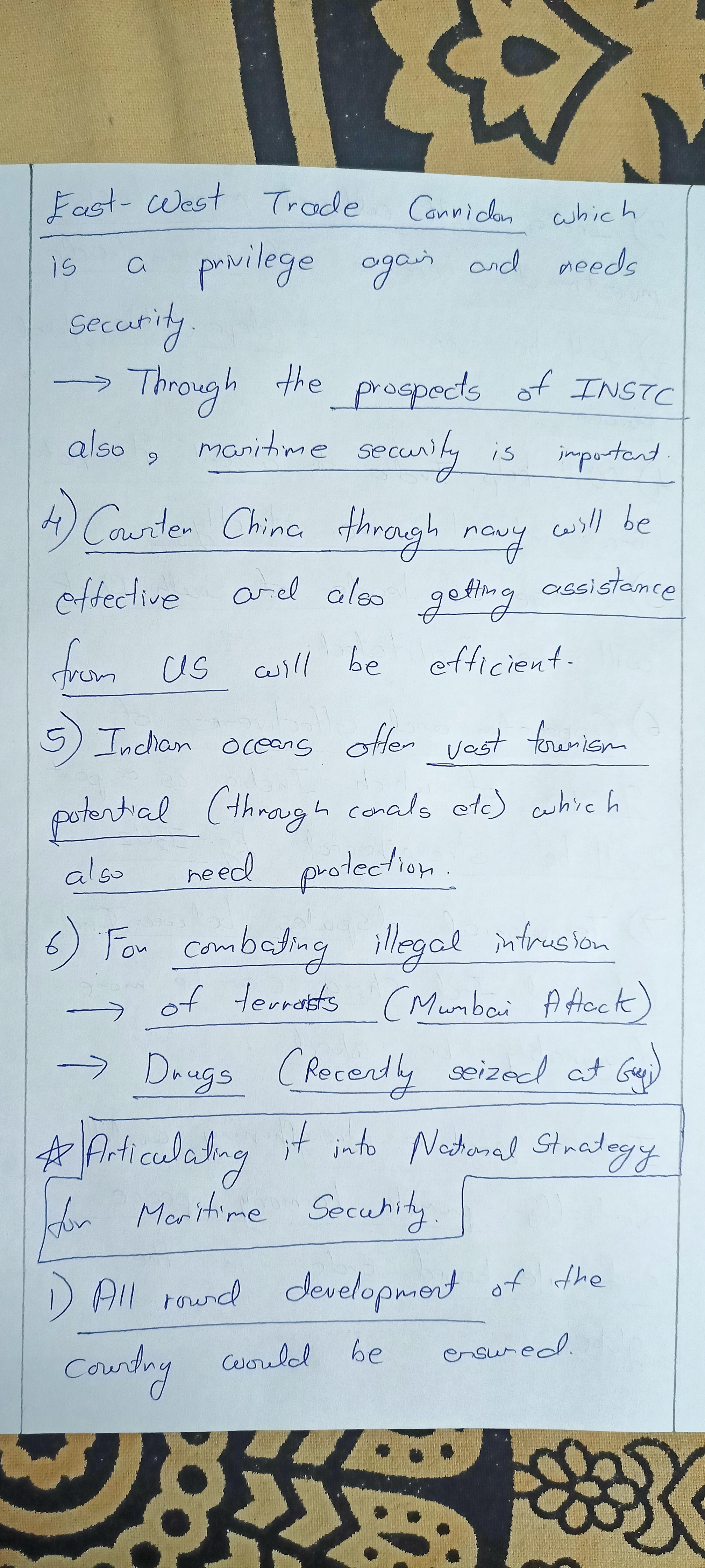 Great answer! You can draw a rough map showing Indian Ocean and show critical choke points. Highlight India’s centrality in Indian Ocean.