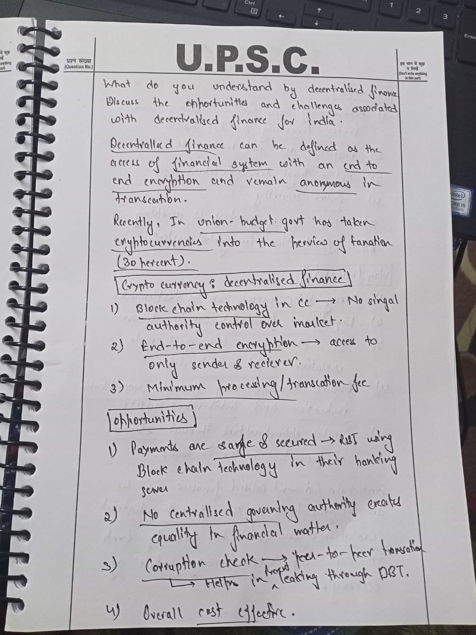 2) What do you understand by Decentralised Finance? Discuss the opportunities and challenges associated with Decentralised Finance for India.