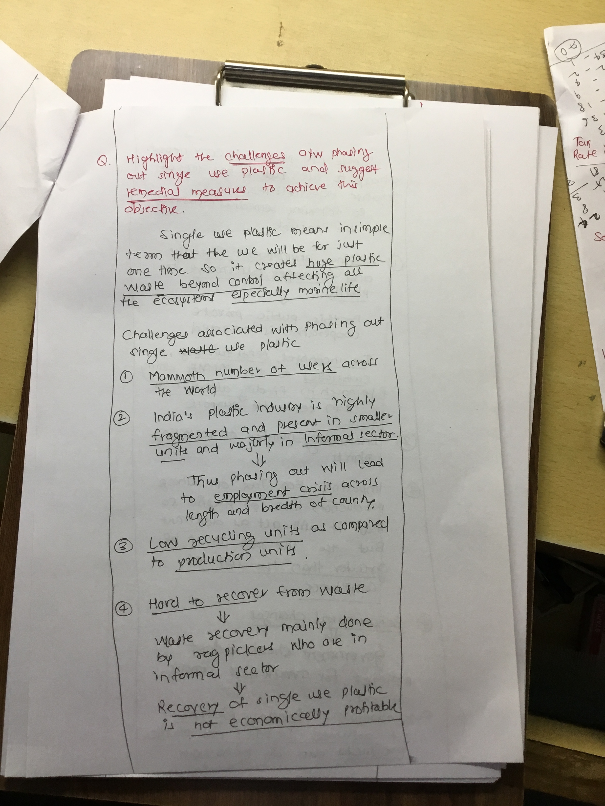 1) Highlight the challenges associated with phasing out single-use plastic and suggest remedial measures to achieve this objective.