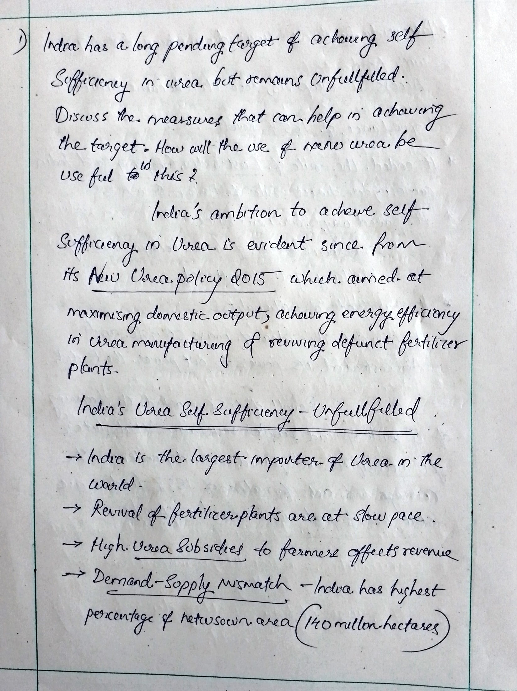 1) India has a long-pending target of achieving self-sufficiency in urea but remains unfulfilled. Discuss the measures that can help in achieving the target. How will the use of nano urea be useful in this?