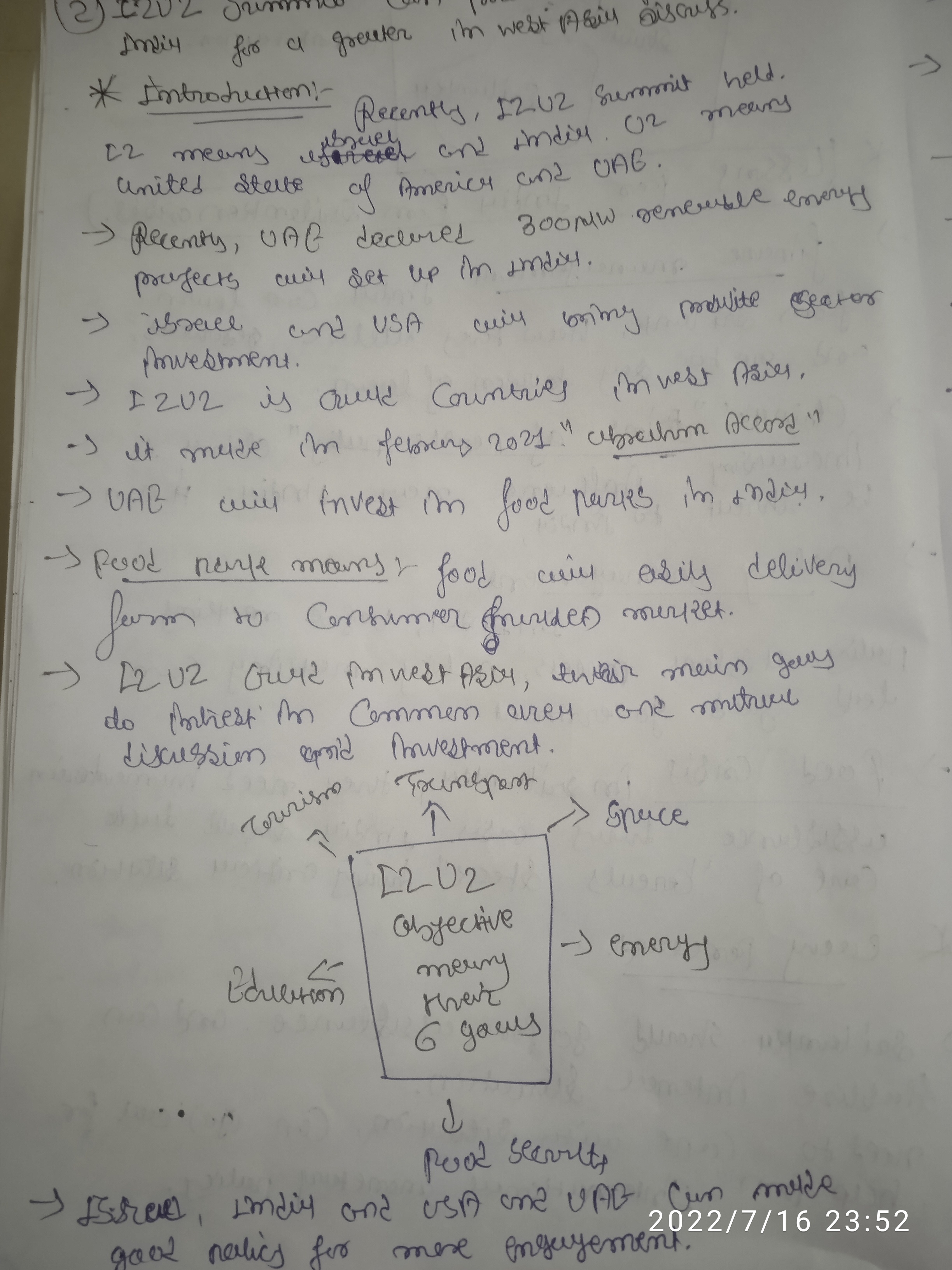 1. In the introduction, you can mention briefly about I2U2 and what are its stated purposes.