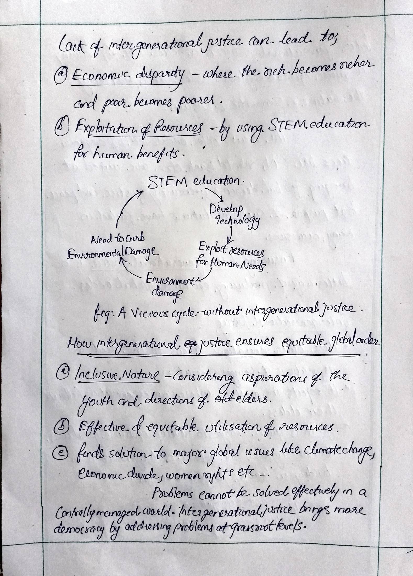 You could have highlighted the issues of climate change/pollution and ecological footprint (resource exploitation and associated intra- and inter-country inequalities). Both these problems will leave an un-inhabitable planet for future generations if left un-addressed (thus intergenerational injustice). STEM diagram you drew is relevant here.