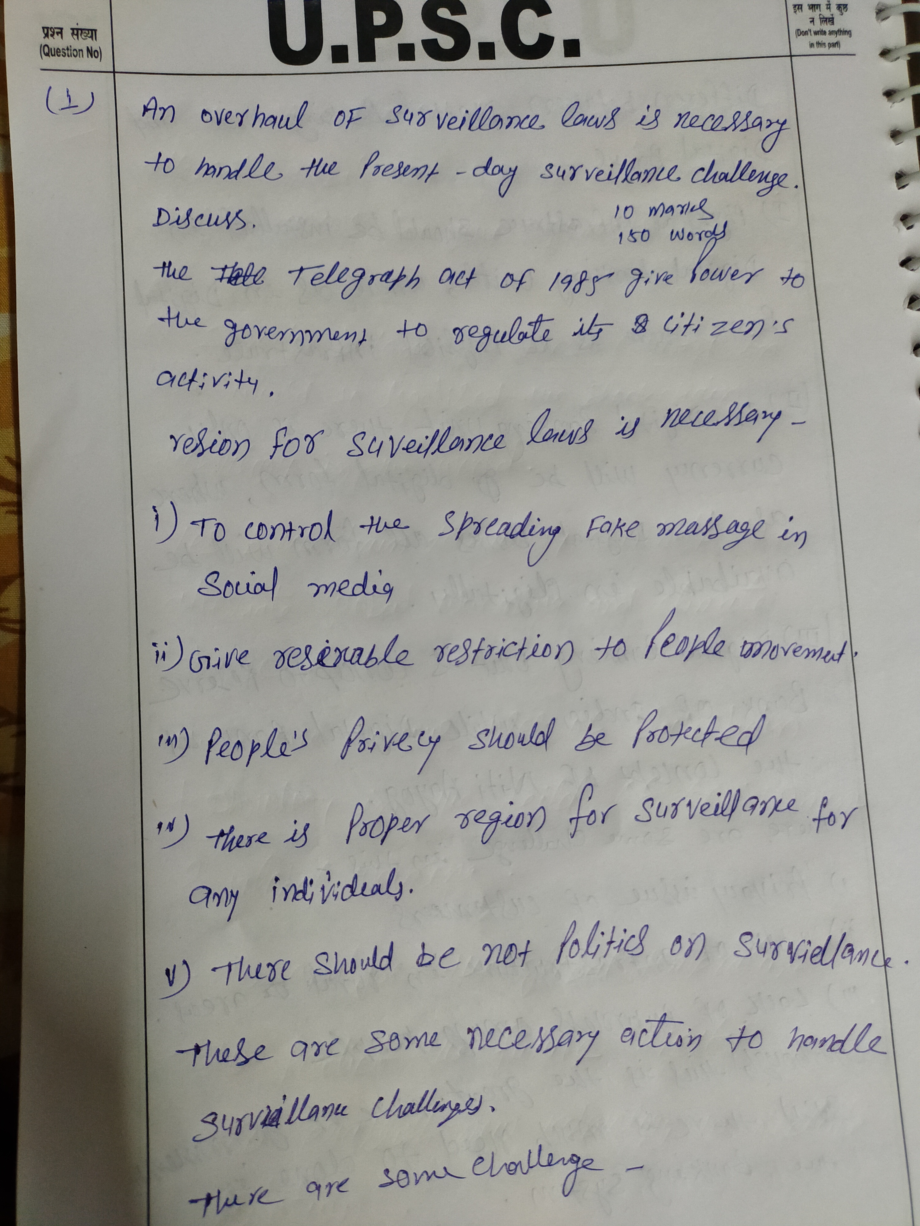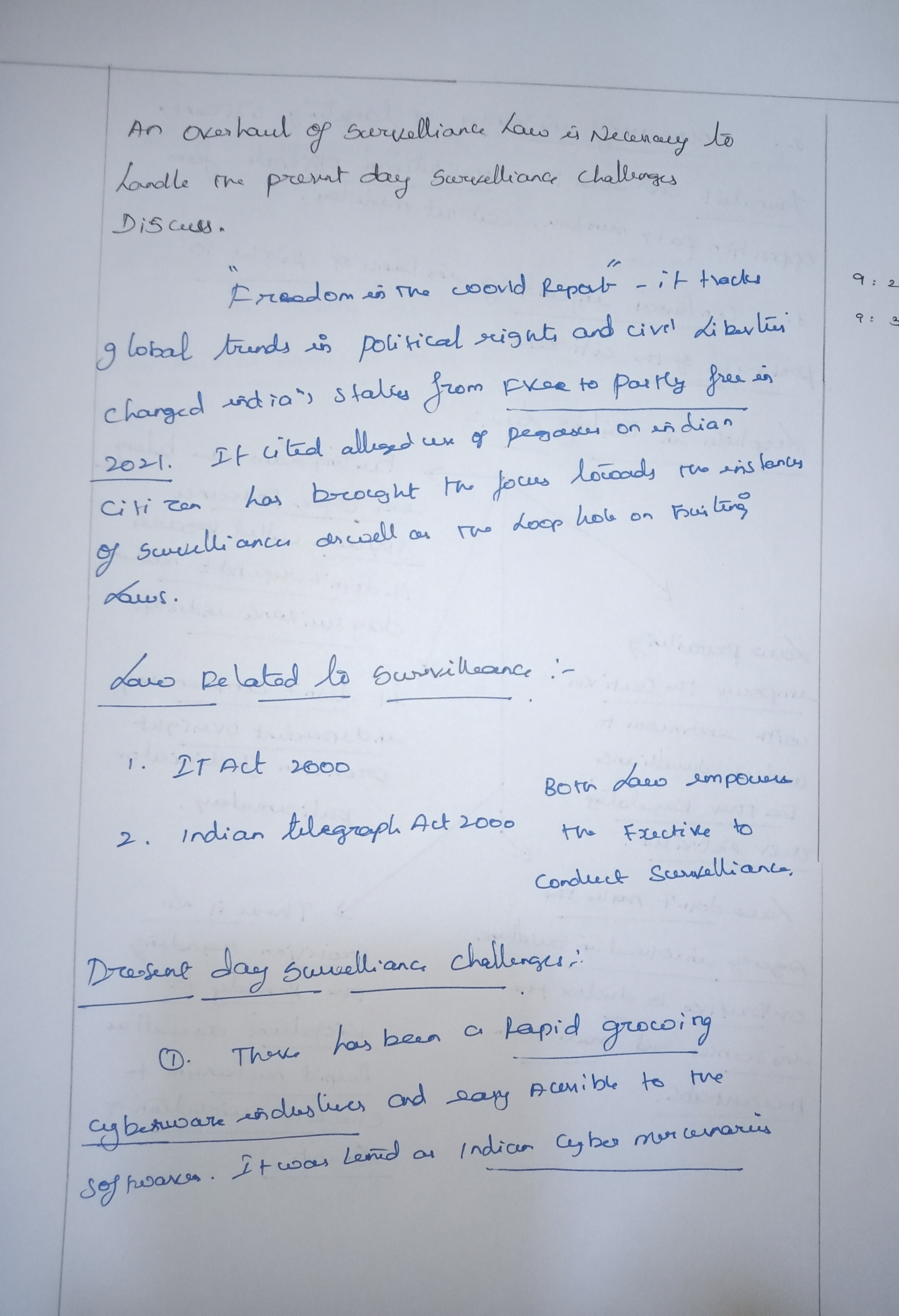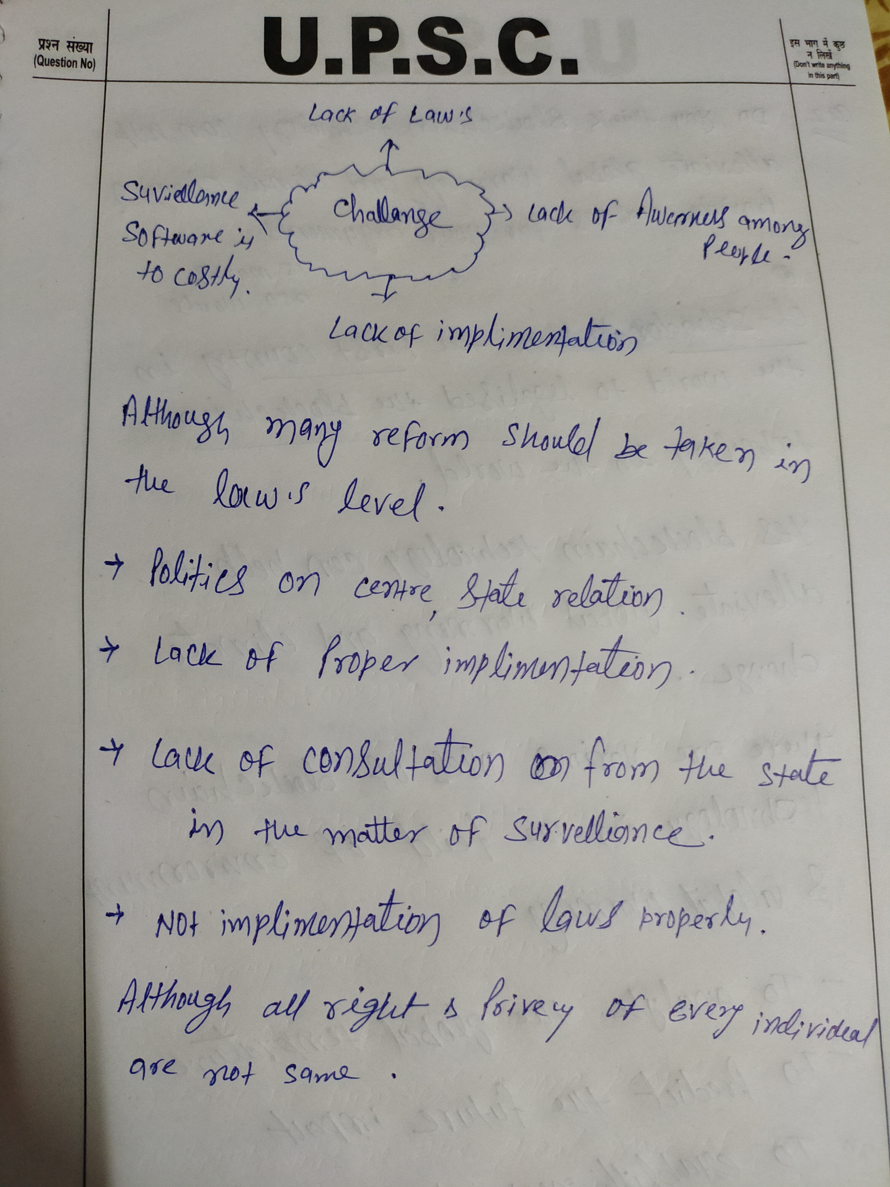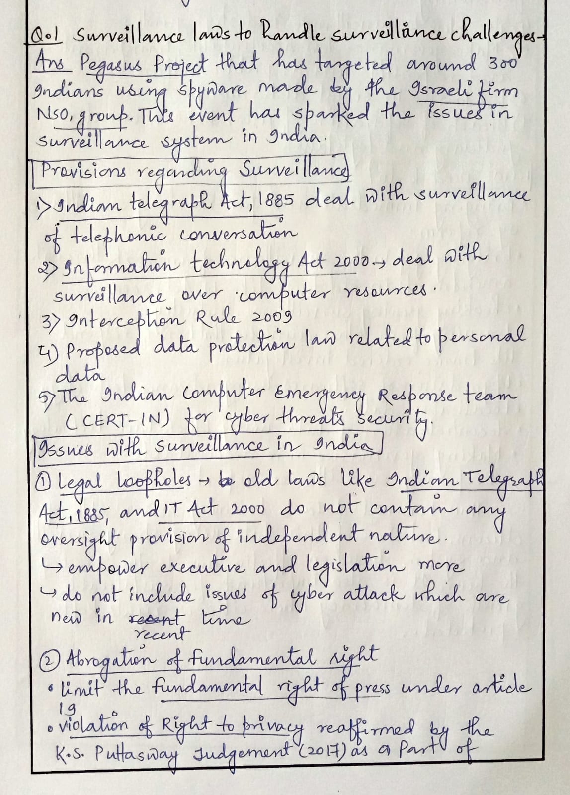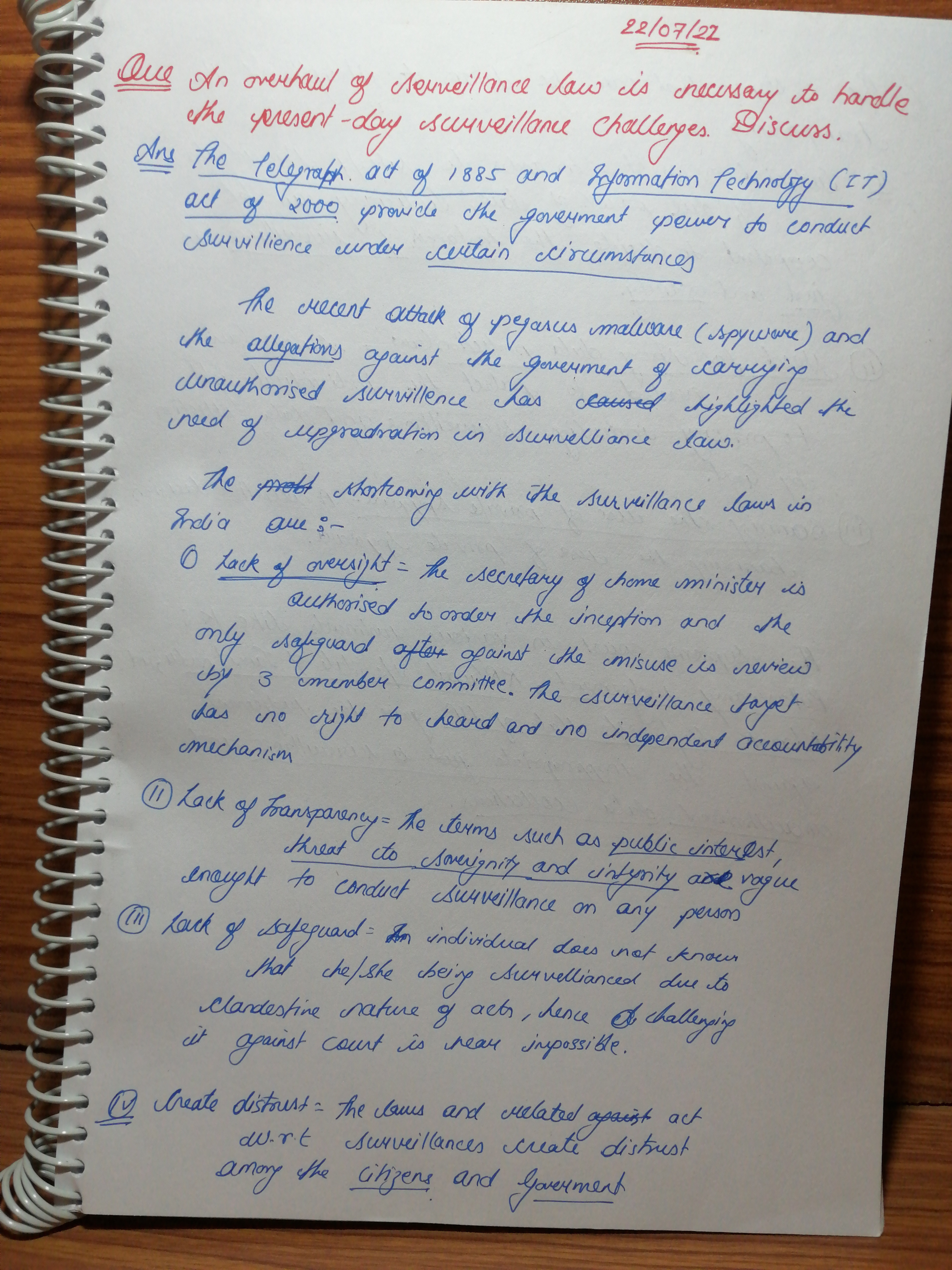 You need to work on the content e.g., in the answer related to surveillance laws, bring out the reason that there is no control to check the actions of Executive, lack of oversight results in misuse. Then clearly mention what reforms can be undertaken. Refer to answers by Rio or Neelesh, you’ll get an idea.