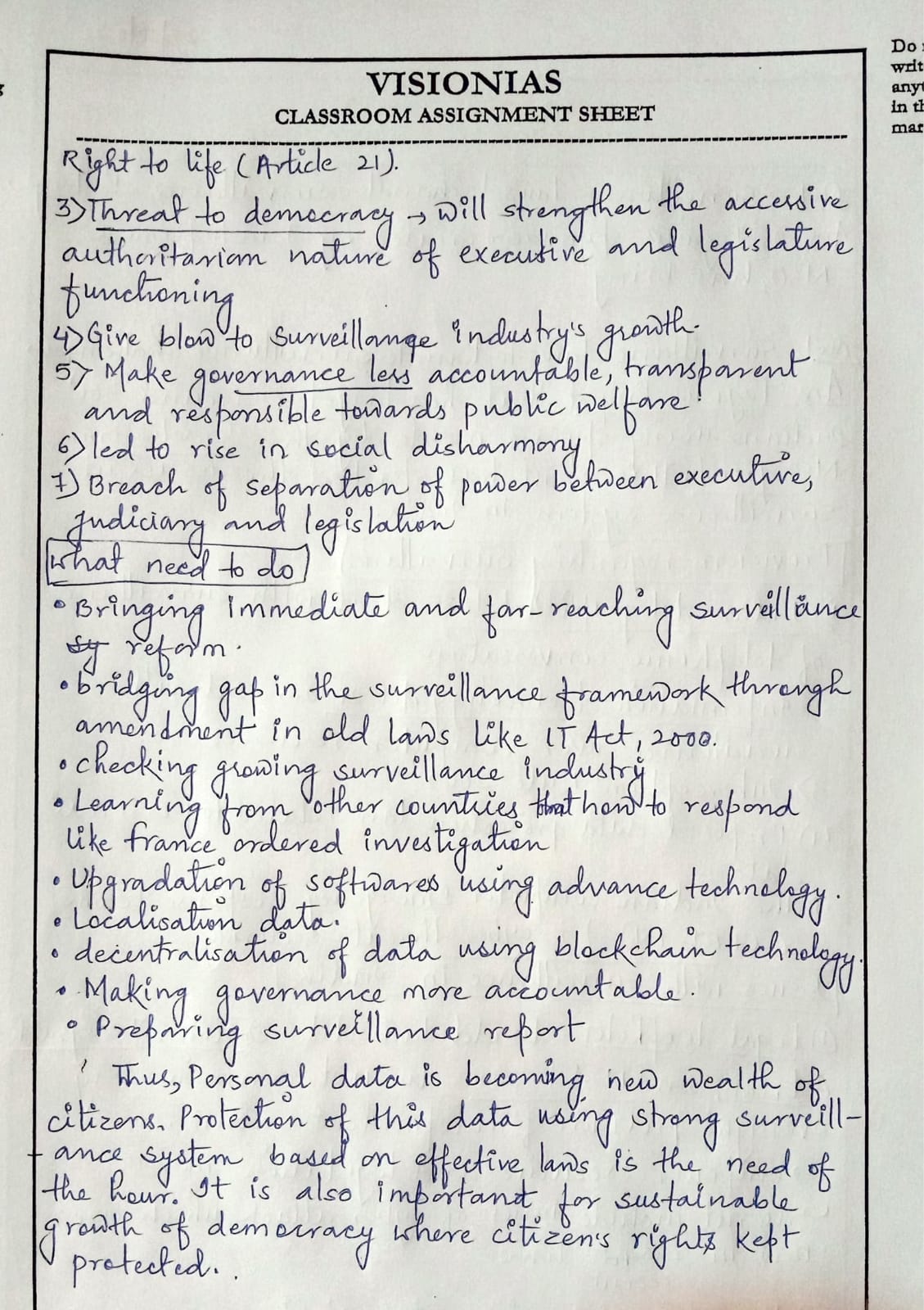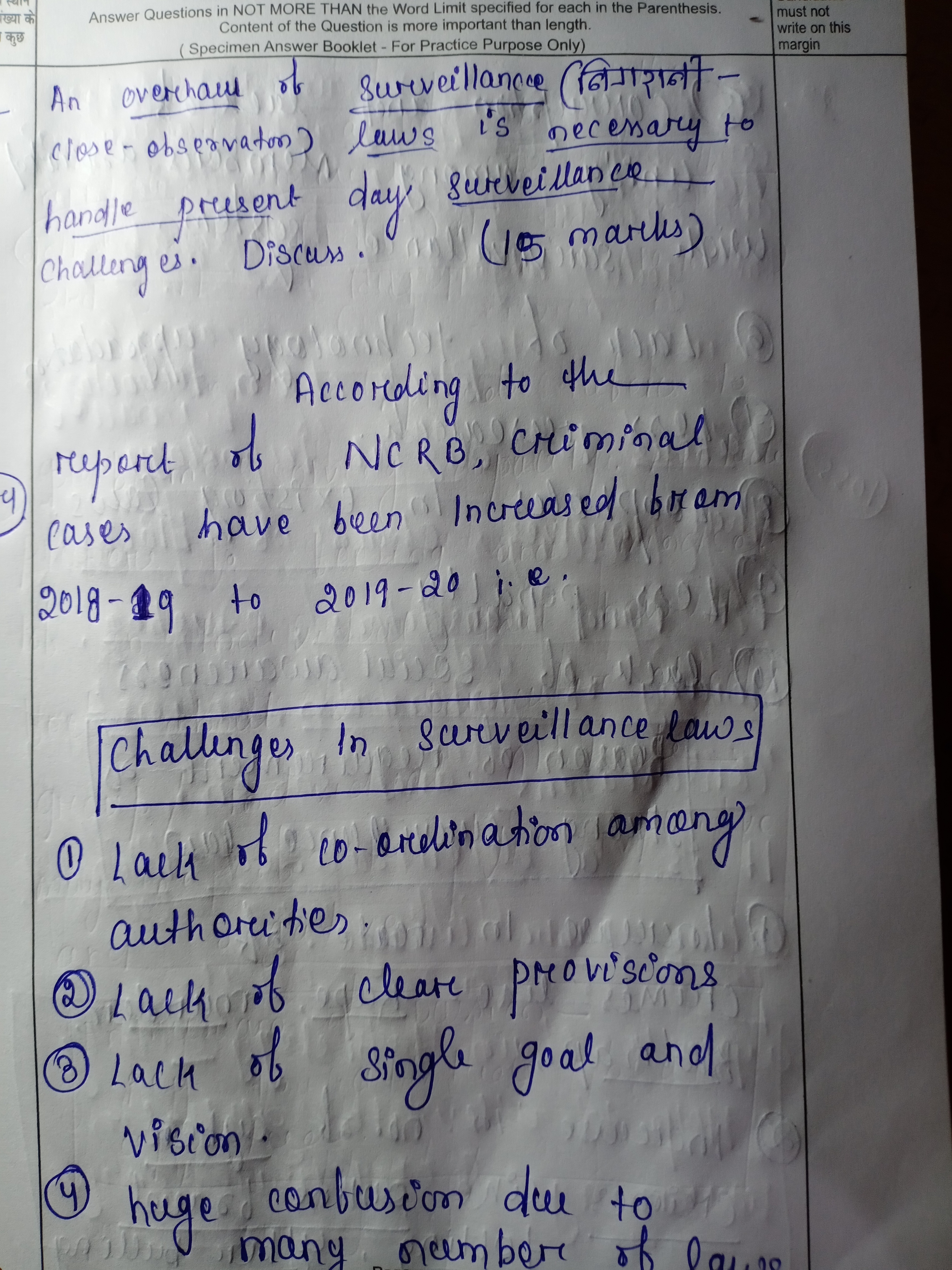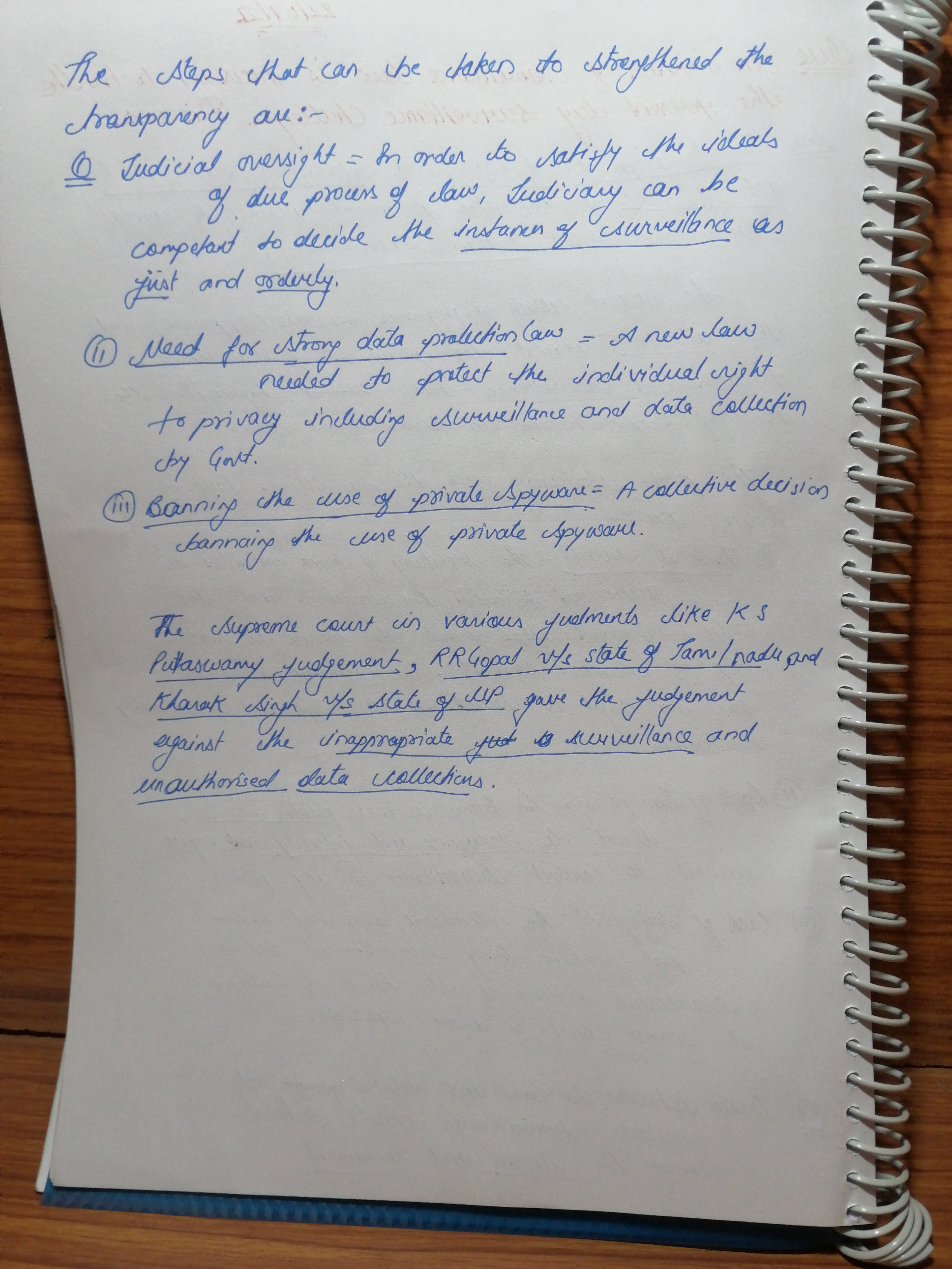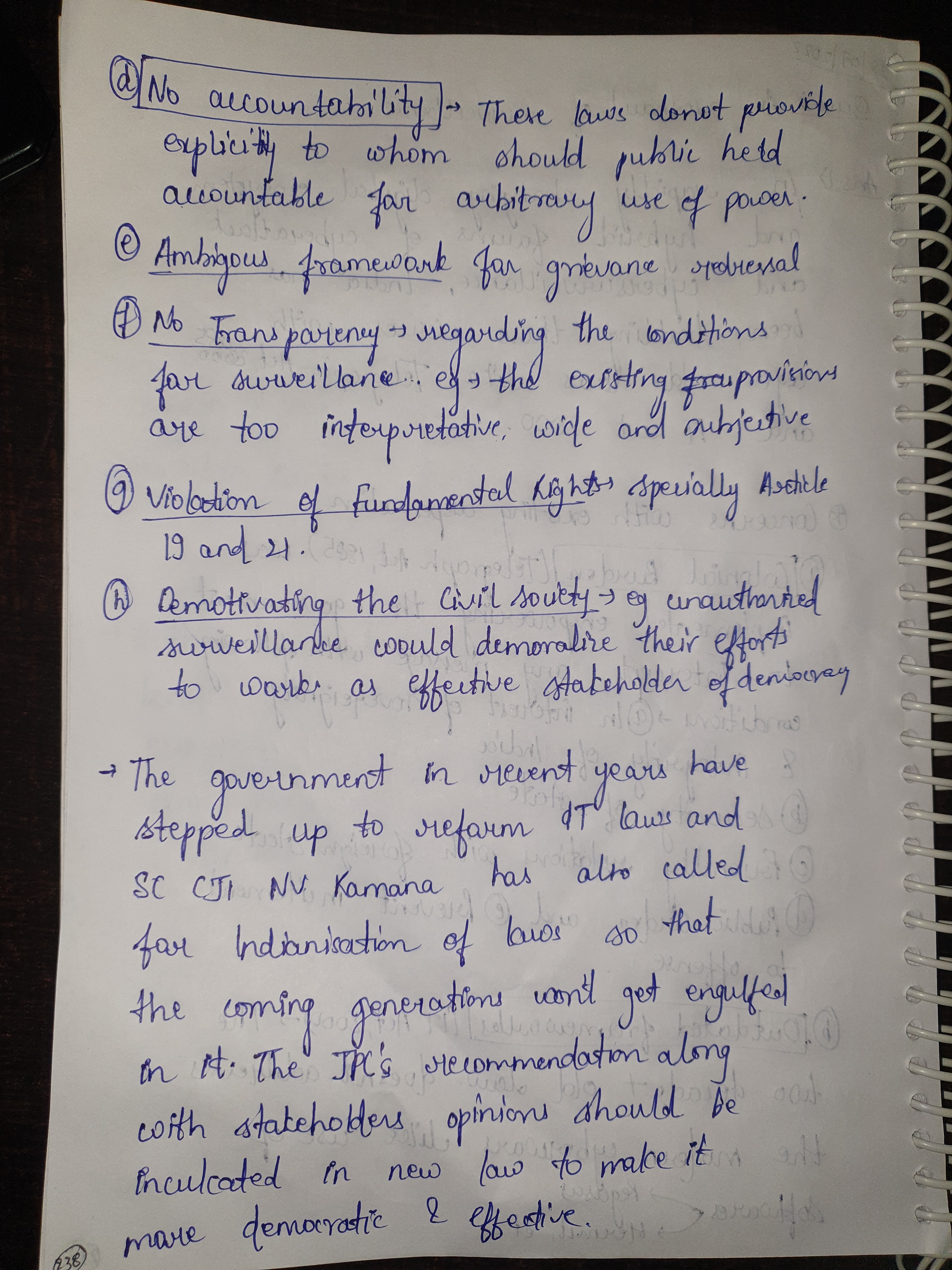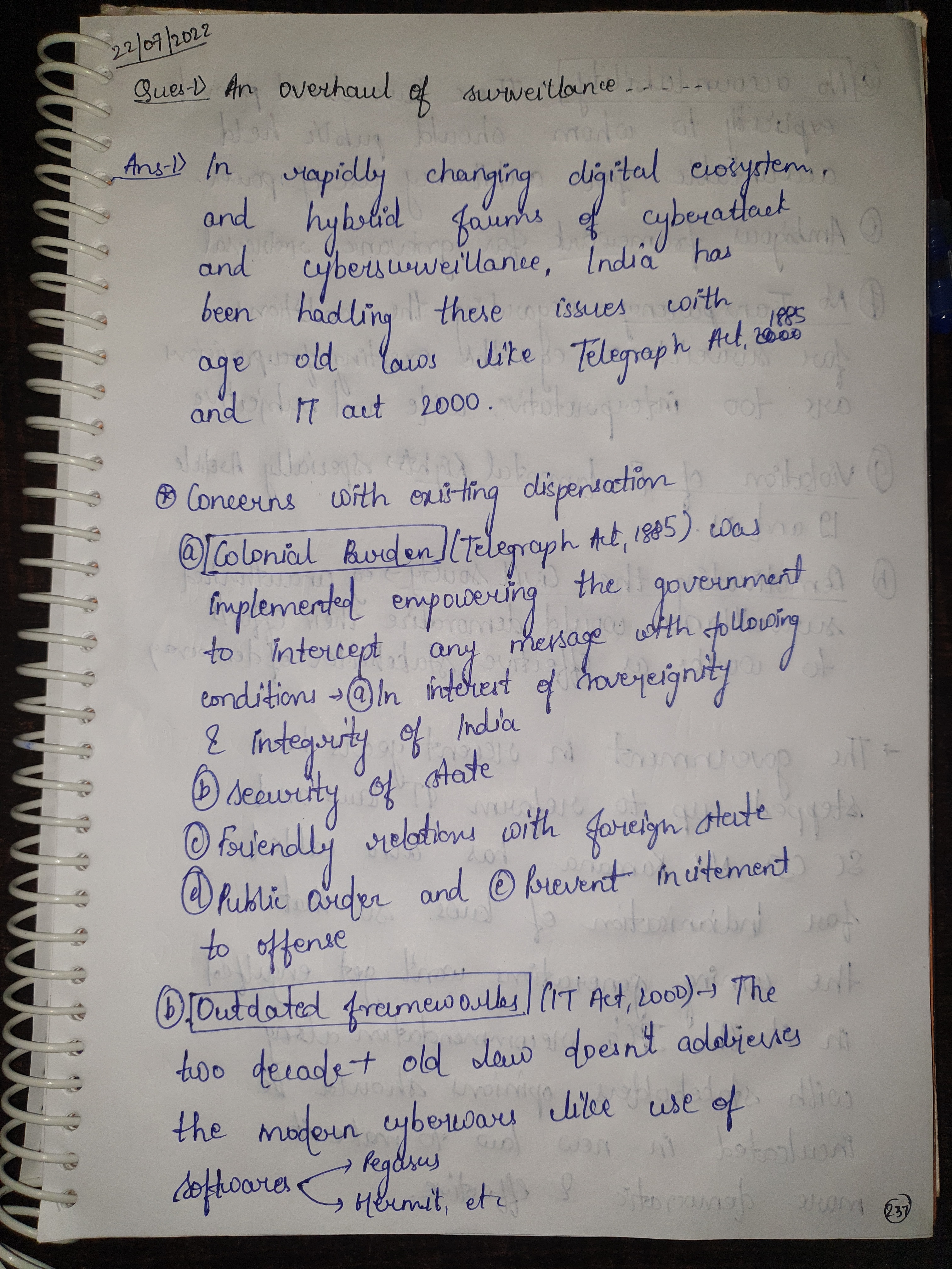 You need to work on the content e.g., in the answer related to surveillance laws, bring out the reason that there is no control to check the actions of Executive, lack of oversight results in misuse. Then clearly mention what reforms can be undertaken. Refer to answers by Rio or Neelesh, you’ll get an idea.
