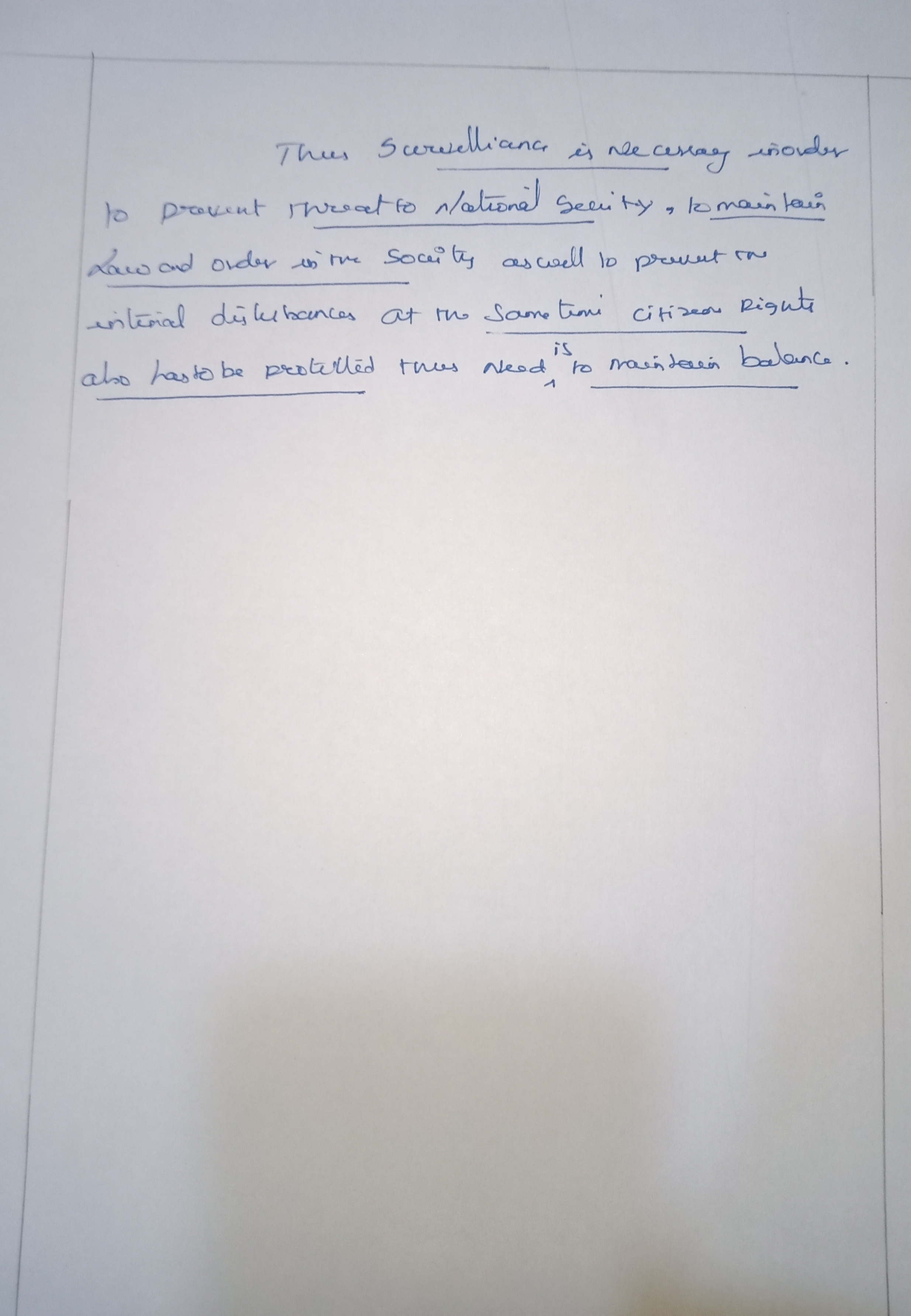 The aspect of how the system can be improved/suggestions has been missed. You could have listed some reform measures like transparency and accountability measures, defining circumstances under which surveillance can be undertaken, procedures to be followed etc. Try to address all the possible dimensions of the question.