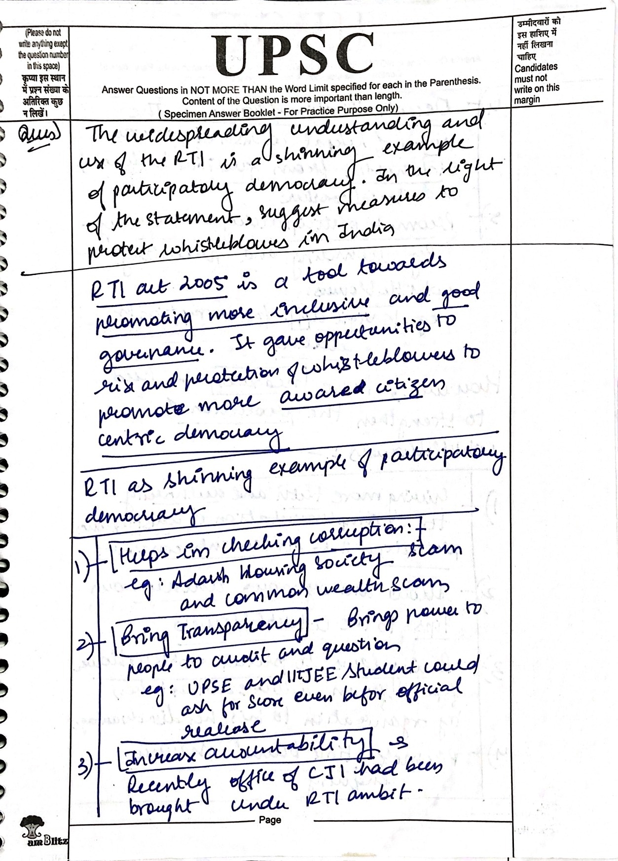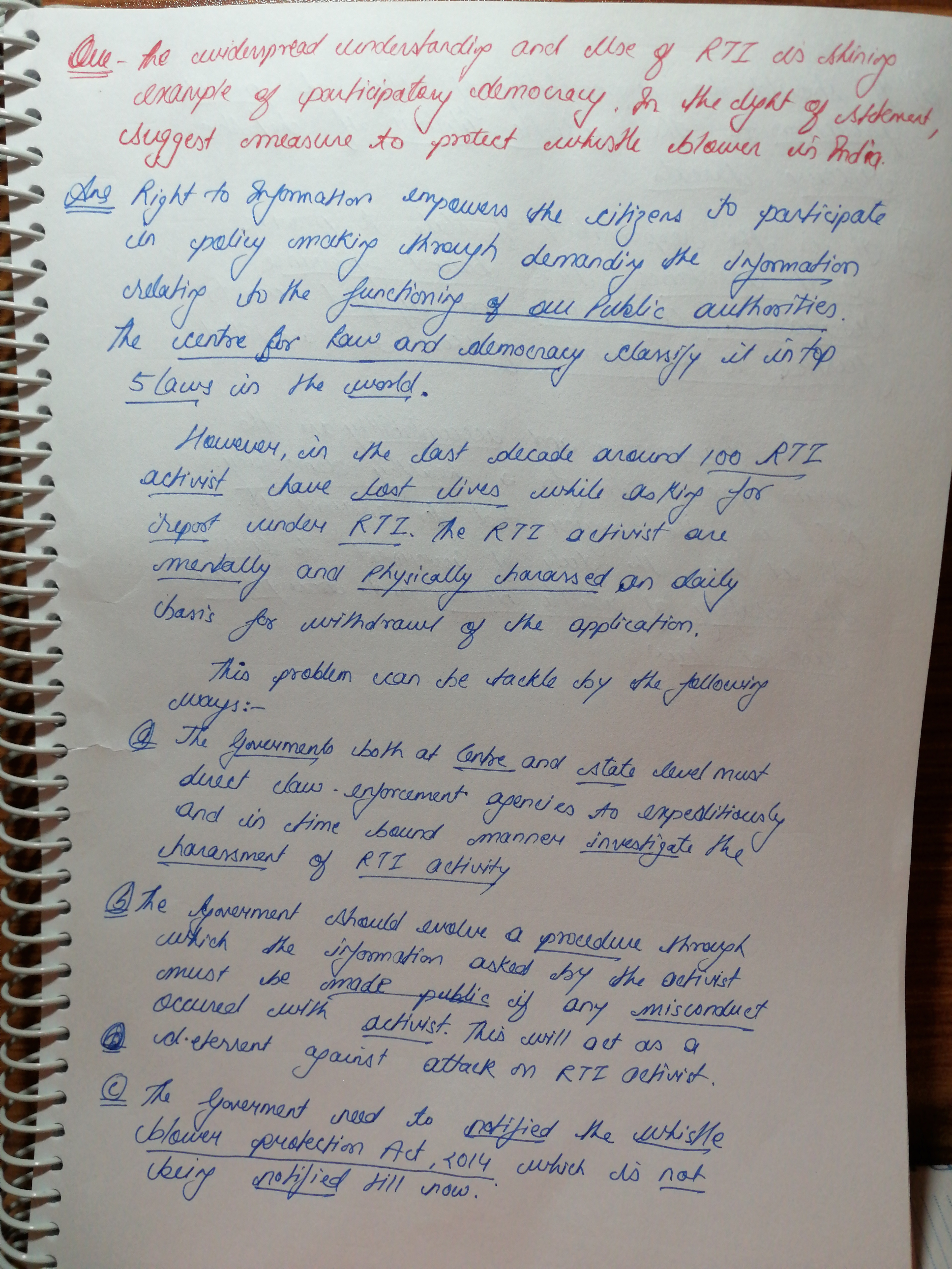 1. Highlight the harassment faced by RTI Activists in 1-2 lines (preferably quote data as well) before shifting to second half of the question (protection of whistleblowers).