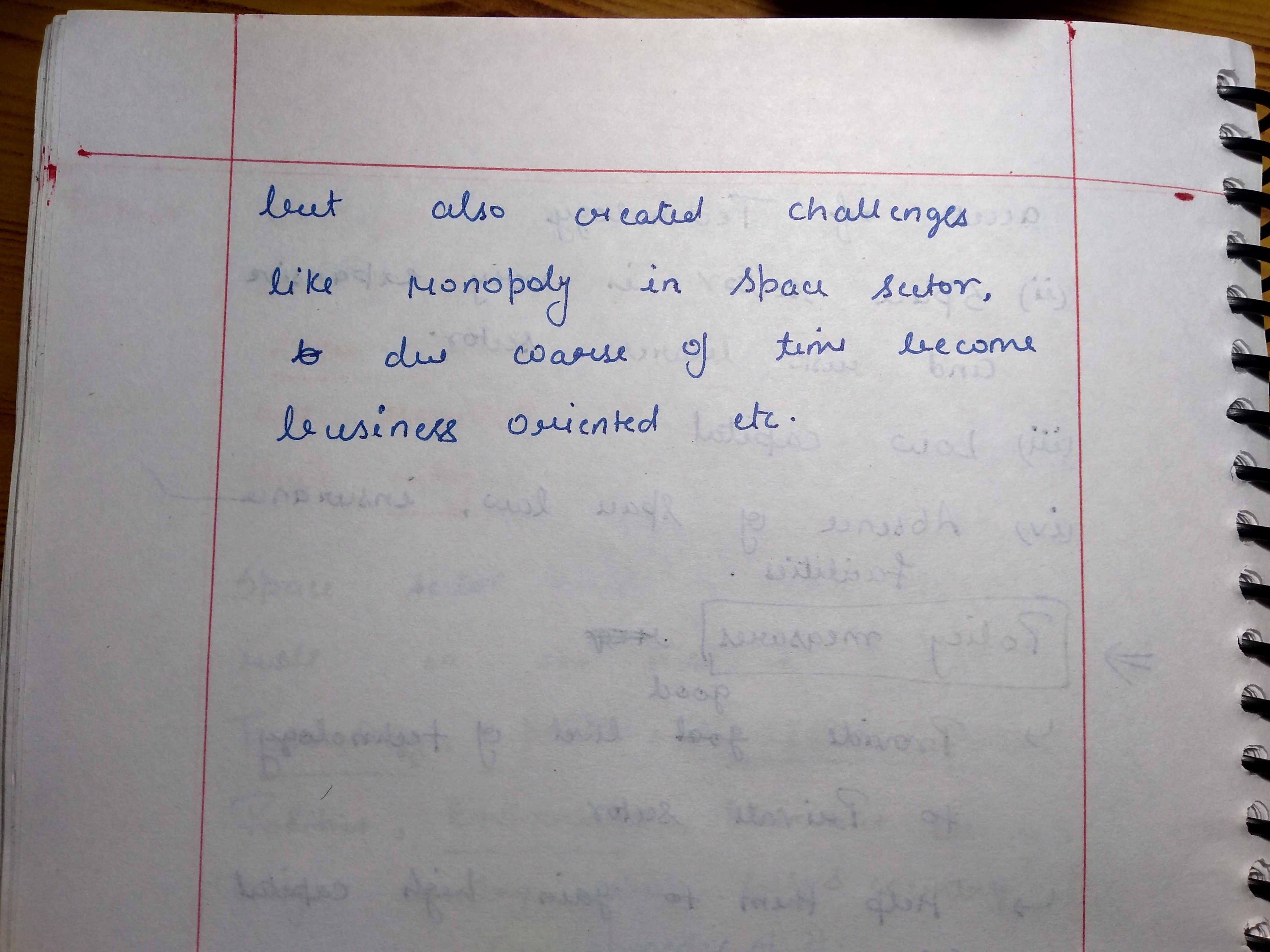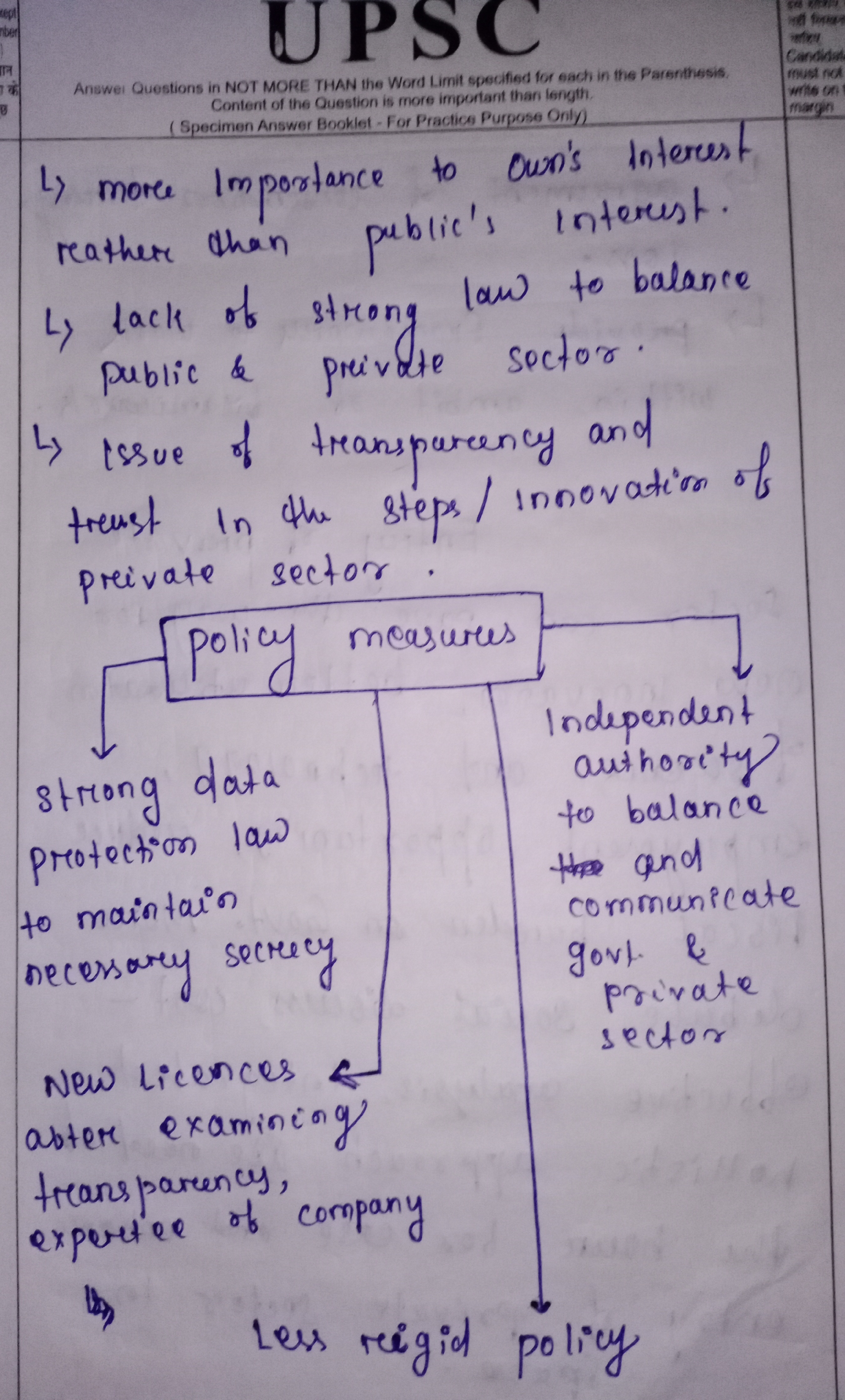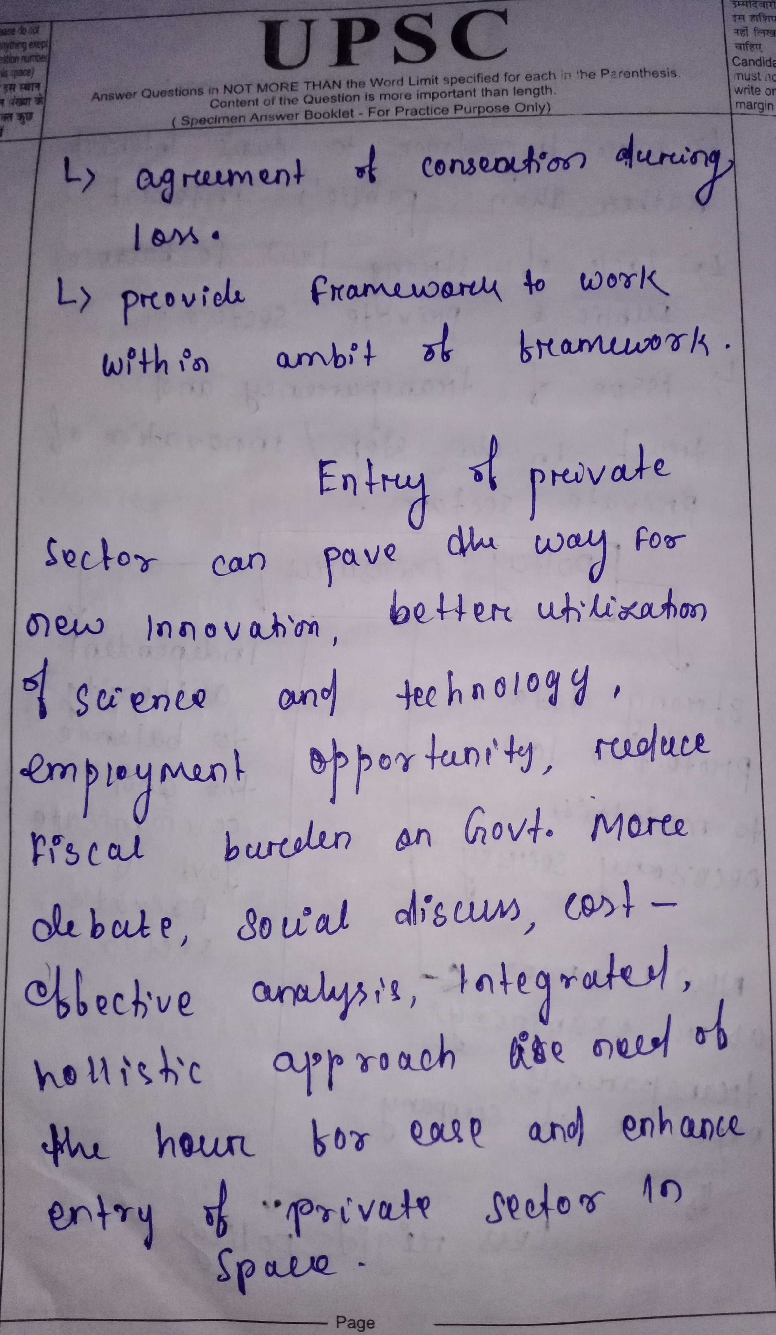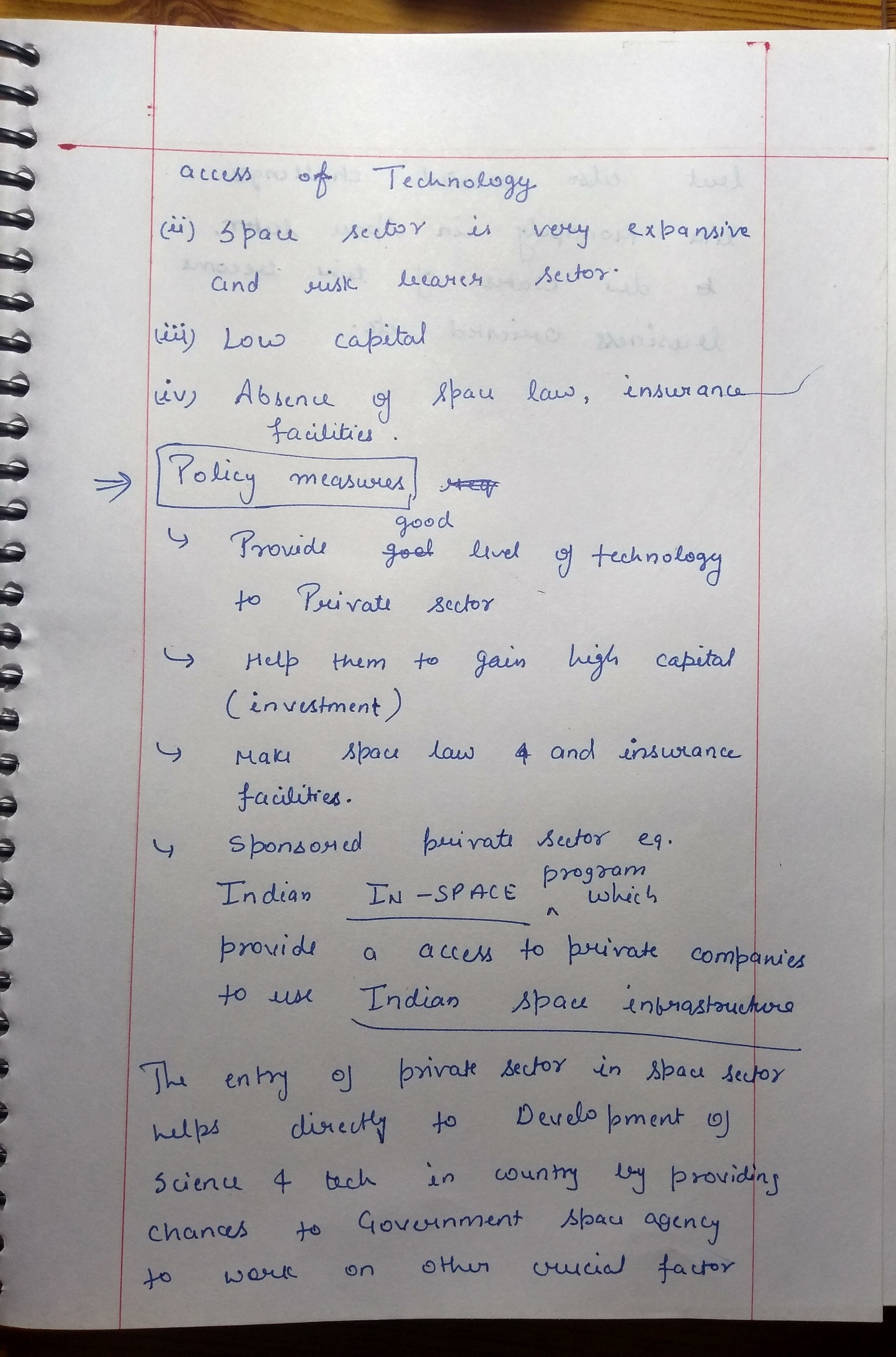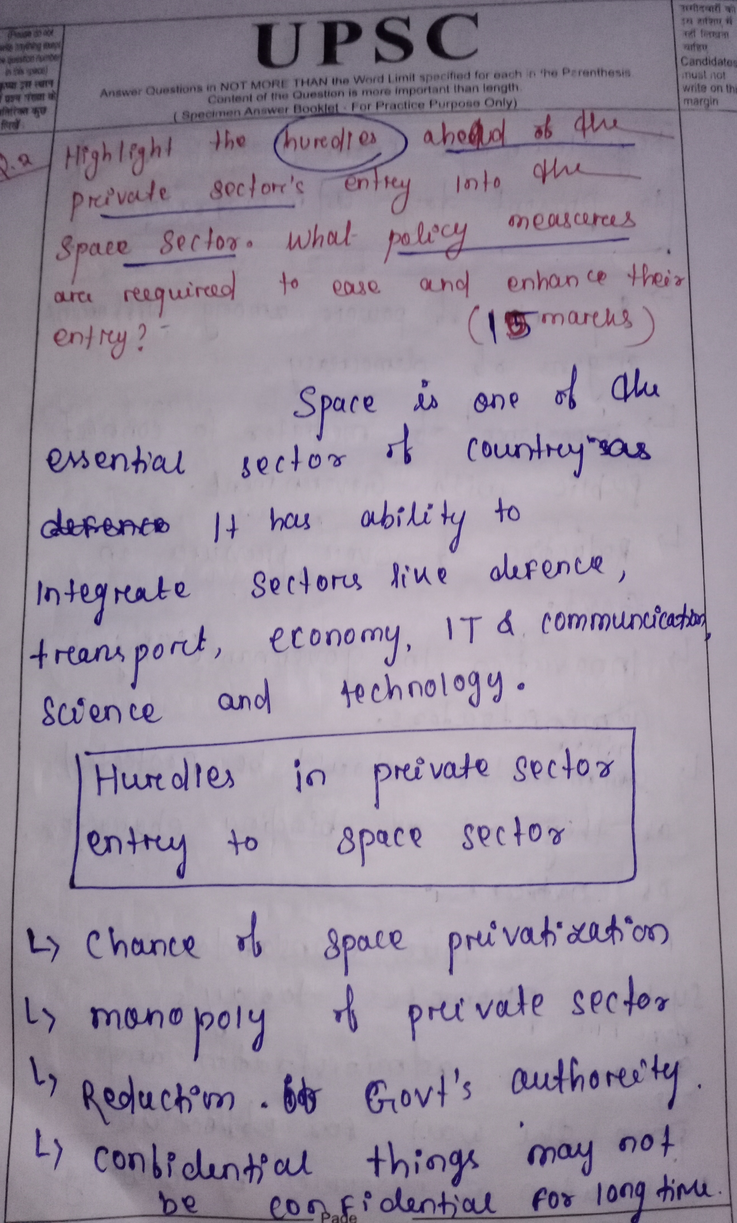 You began well, but didn’t mention the biggest challenges in private participation. Those are: (a) Requirement of high capital (space sector is very capital intensive e.g., making satellites requires huge amounts of money); (b) R&D oriented, so there is a need of strong R&D ecosystem which takes time to establish; (c) Attracting highly skilled talent e.g., there is need of graduates with Masters/PhD having strong propensity for research which is lacking in India etc. You should have answered on these lines. Fears of Monopoly of private sector are not a challenge per se, it can be addressed by appropriate policy measures (like independent authority which you have mentioned in the policy measures 🙂 ).