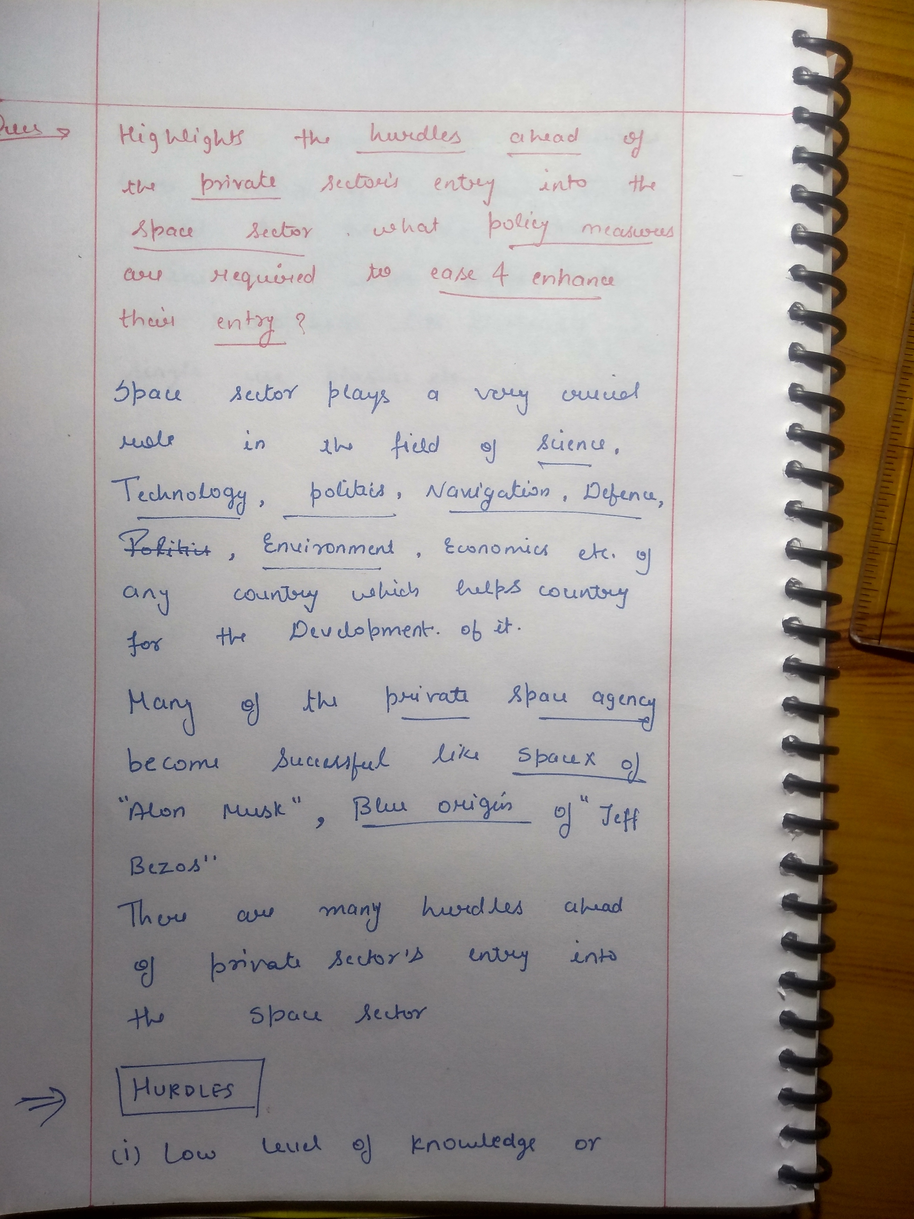 2.) Highlight the hurdles ahead of the private sector’s entry into the space sector. What policy measures are required to ease and enhance their entry?