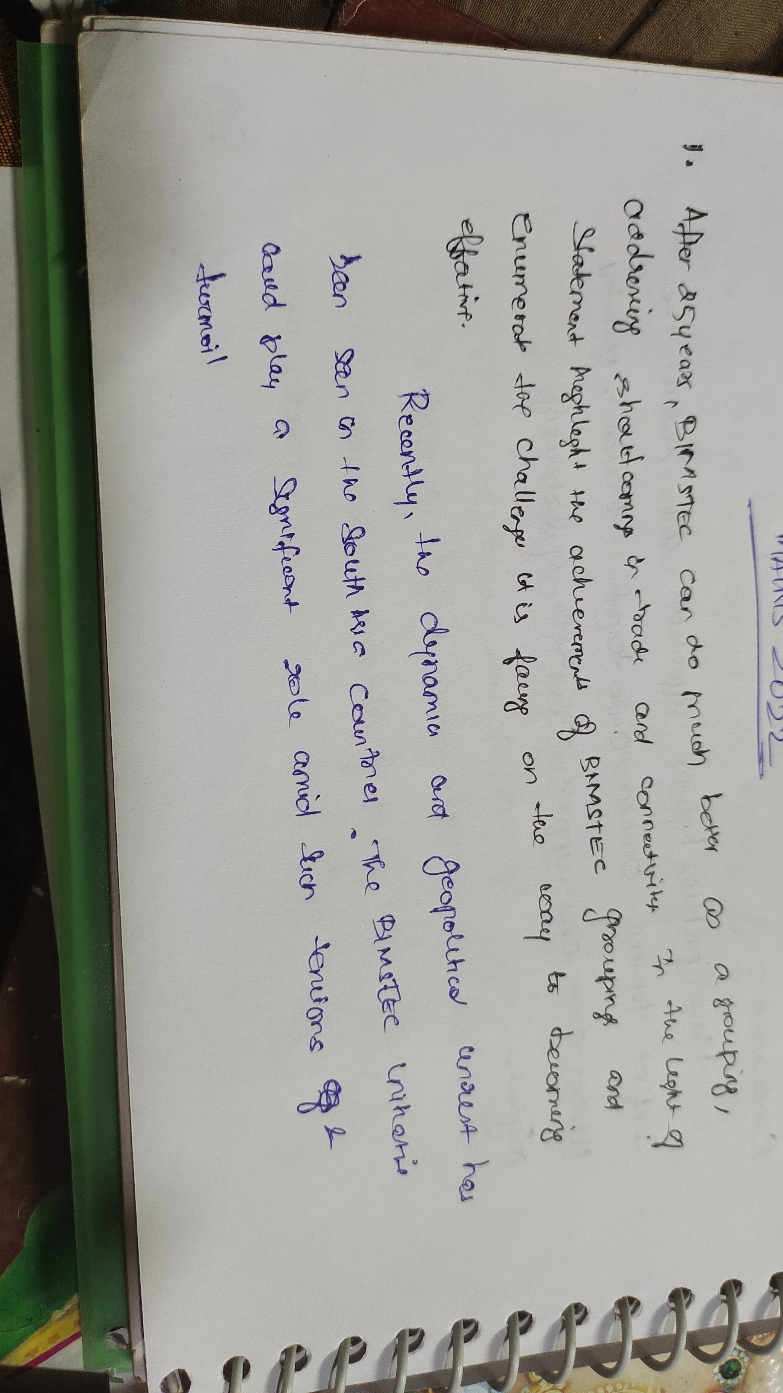 1) After 25 years, BIMSTEC can do much better as a grouping, addressing shortcomings in trade and connectivity. In the light of the statement, highlight the achievements of BIMSTEC grouping and enumerate the challenges it is facing on the way to becoming effective.