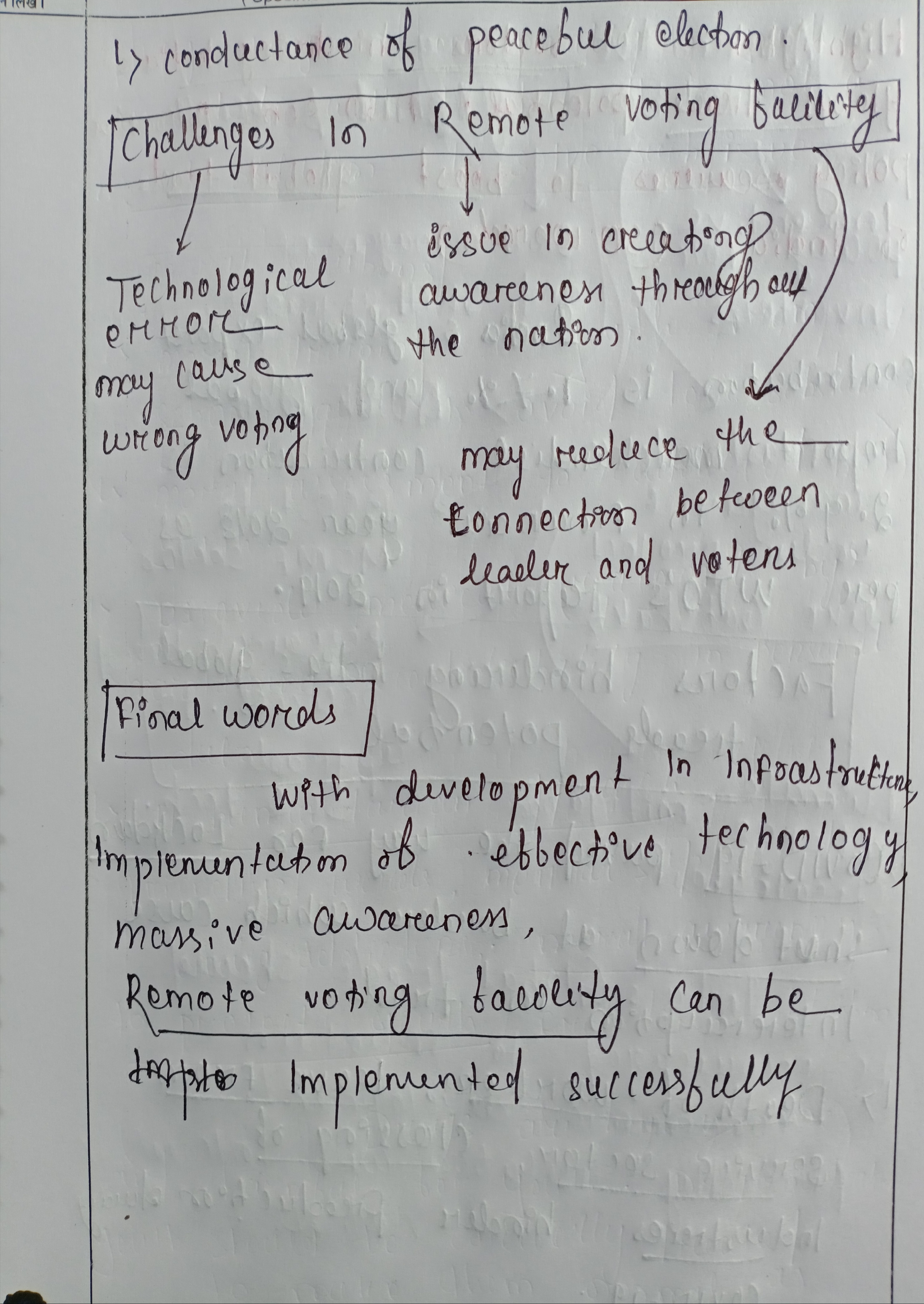 Good one, clearly titled points which are easily readable. Good points made regarding benefits of remote voting and associated challenges. Schematic diagram is nice, could have elaborated the challenges in 1-2 line max.