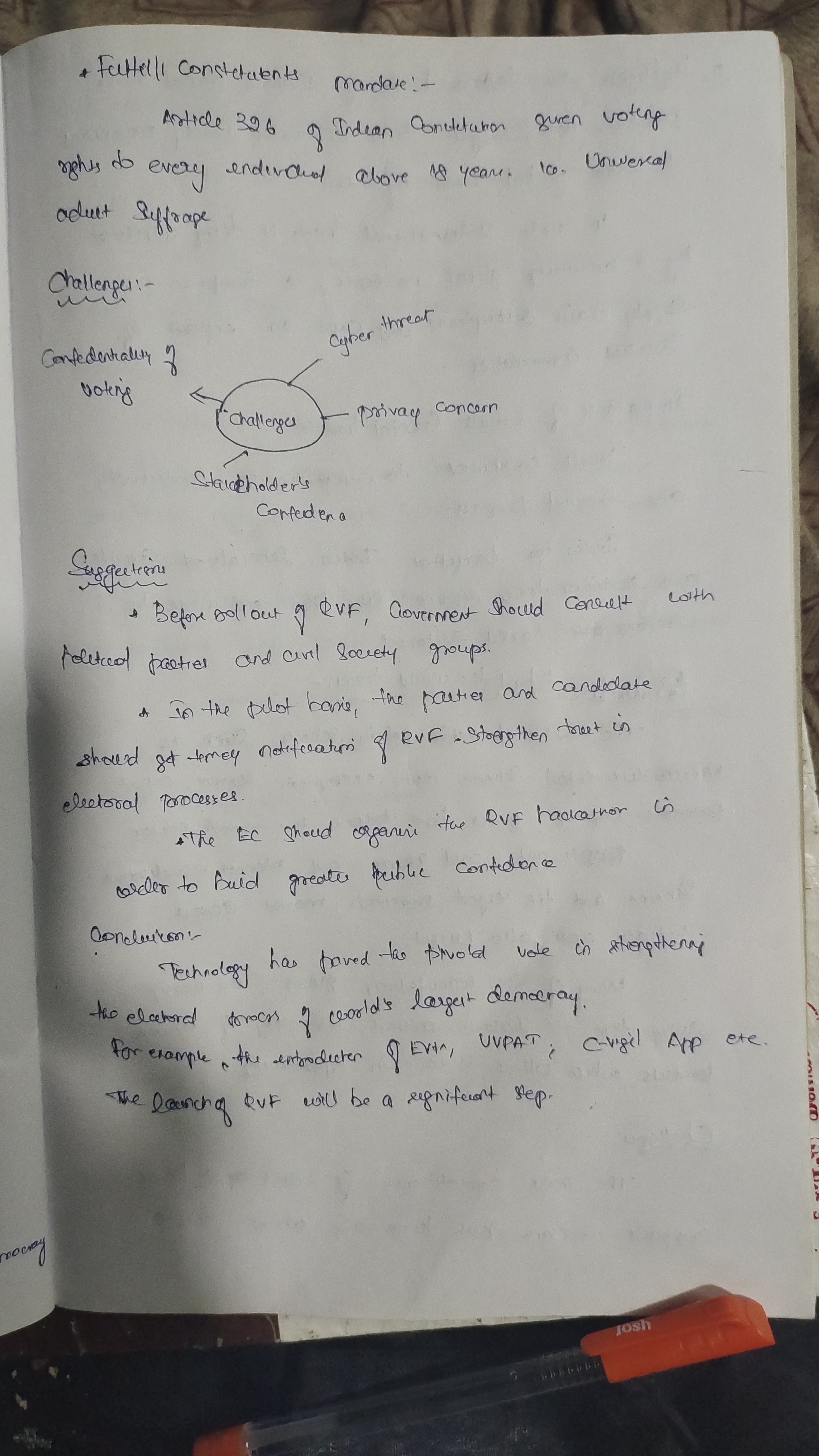 2. In challenges, you can include more points like threat of attacks, ensuring privacy (so that no one in the system knows about voter’s choice), integrity of the process (e.g., politicians raise doubts over EVMs despite their robustness), logistics etc.