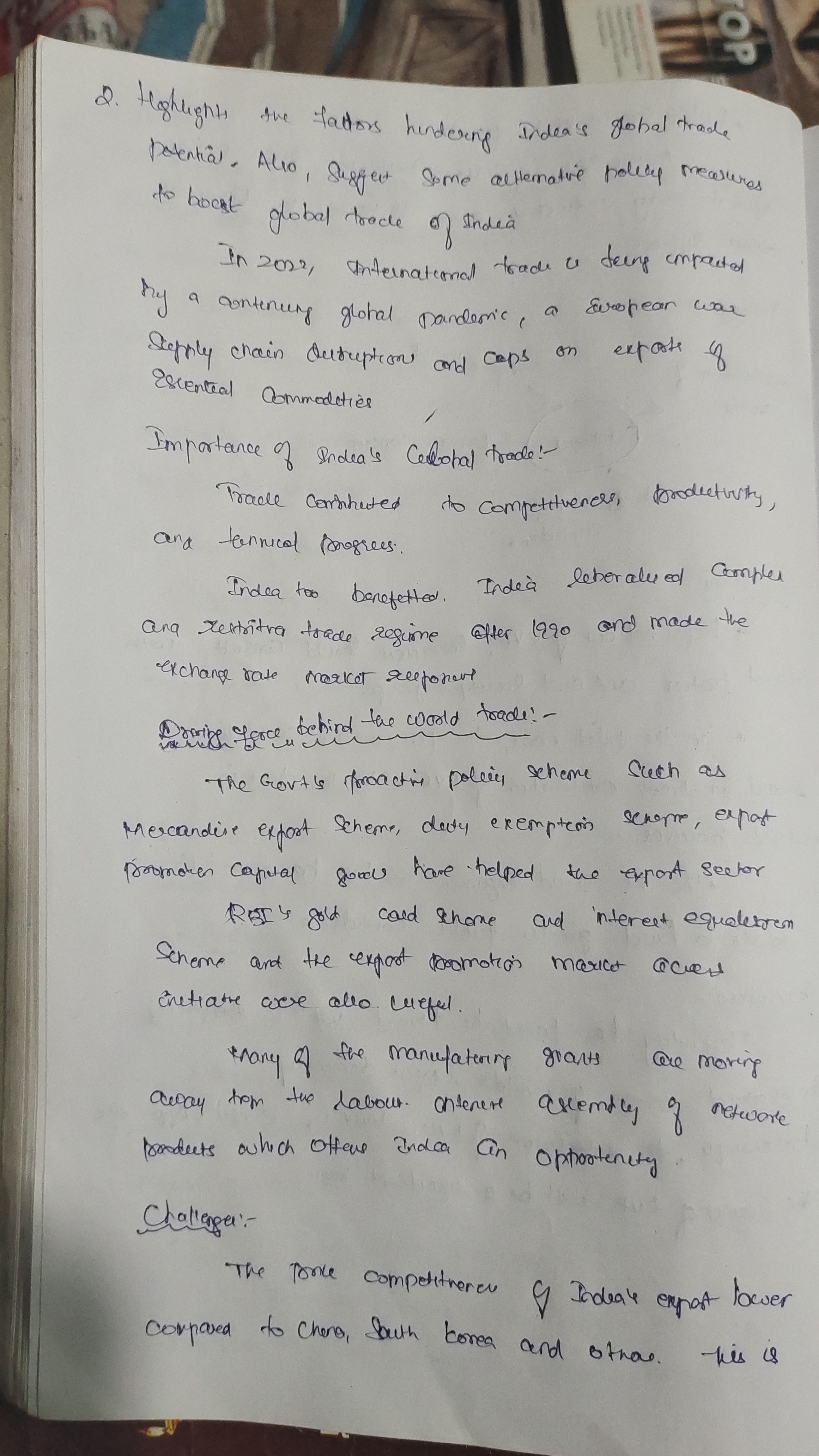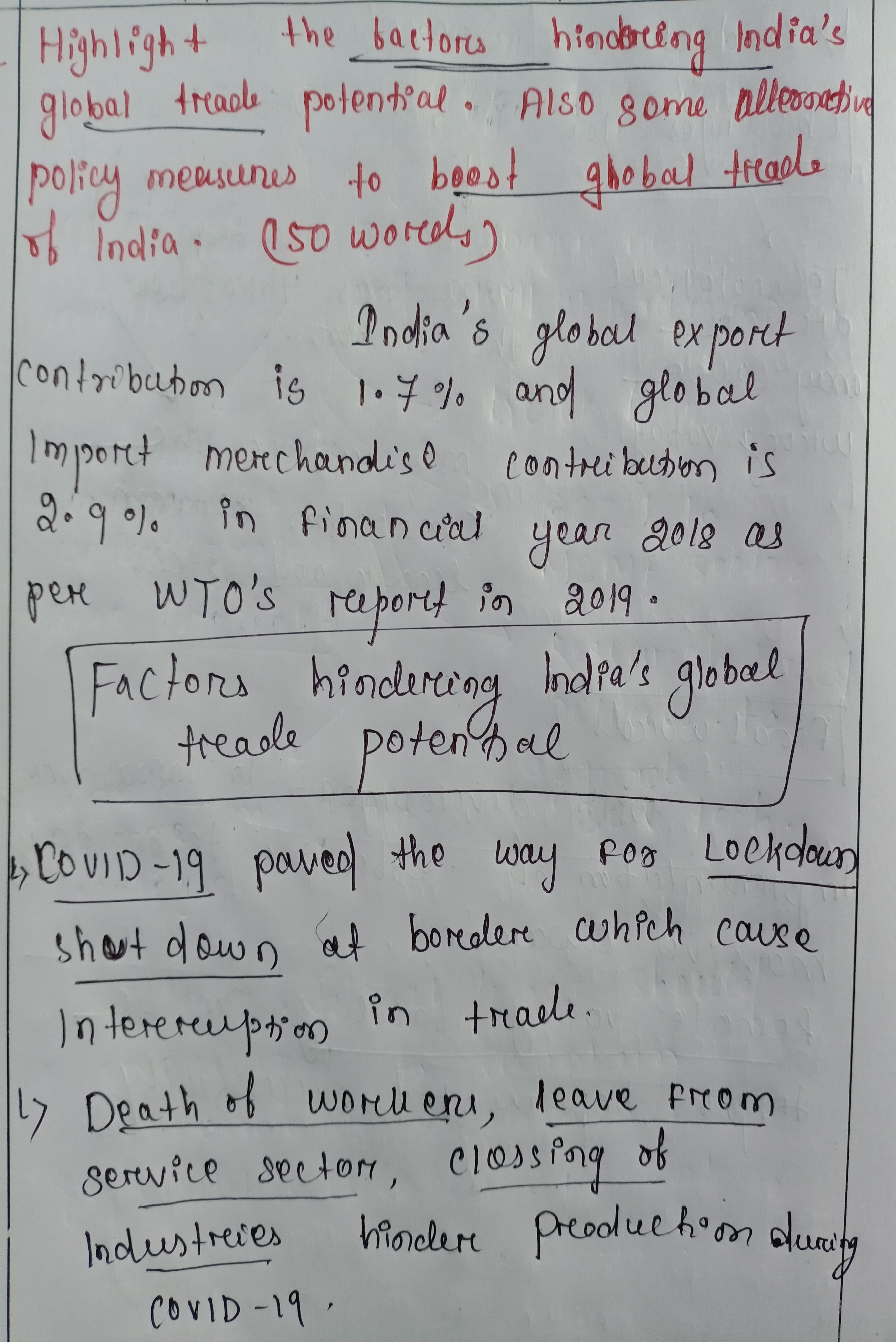 2) Highlight the factors hindering India’s global trade potential. Also, suggest some alternative policy measures to boost global trade of India.
