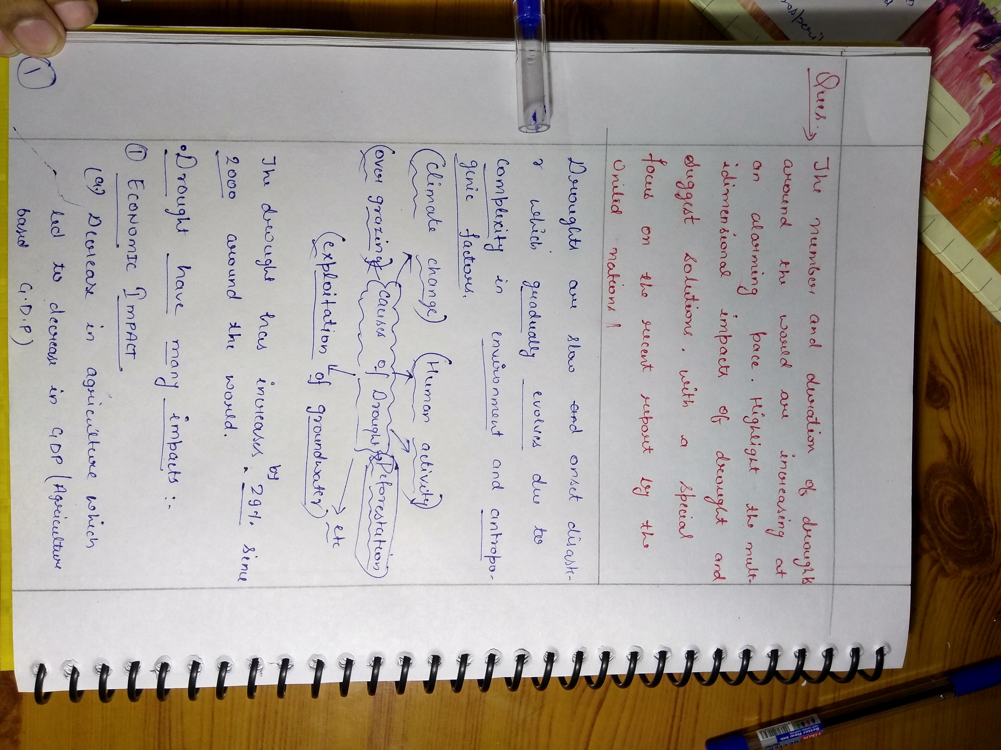 1.) The number and duration of droughts around the world are increasing at an alarming pace. Highlight the multidimensional impacts of drought and suggest solutions, with a special focus on the recent report by the United Nations.